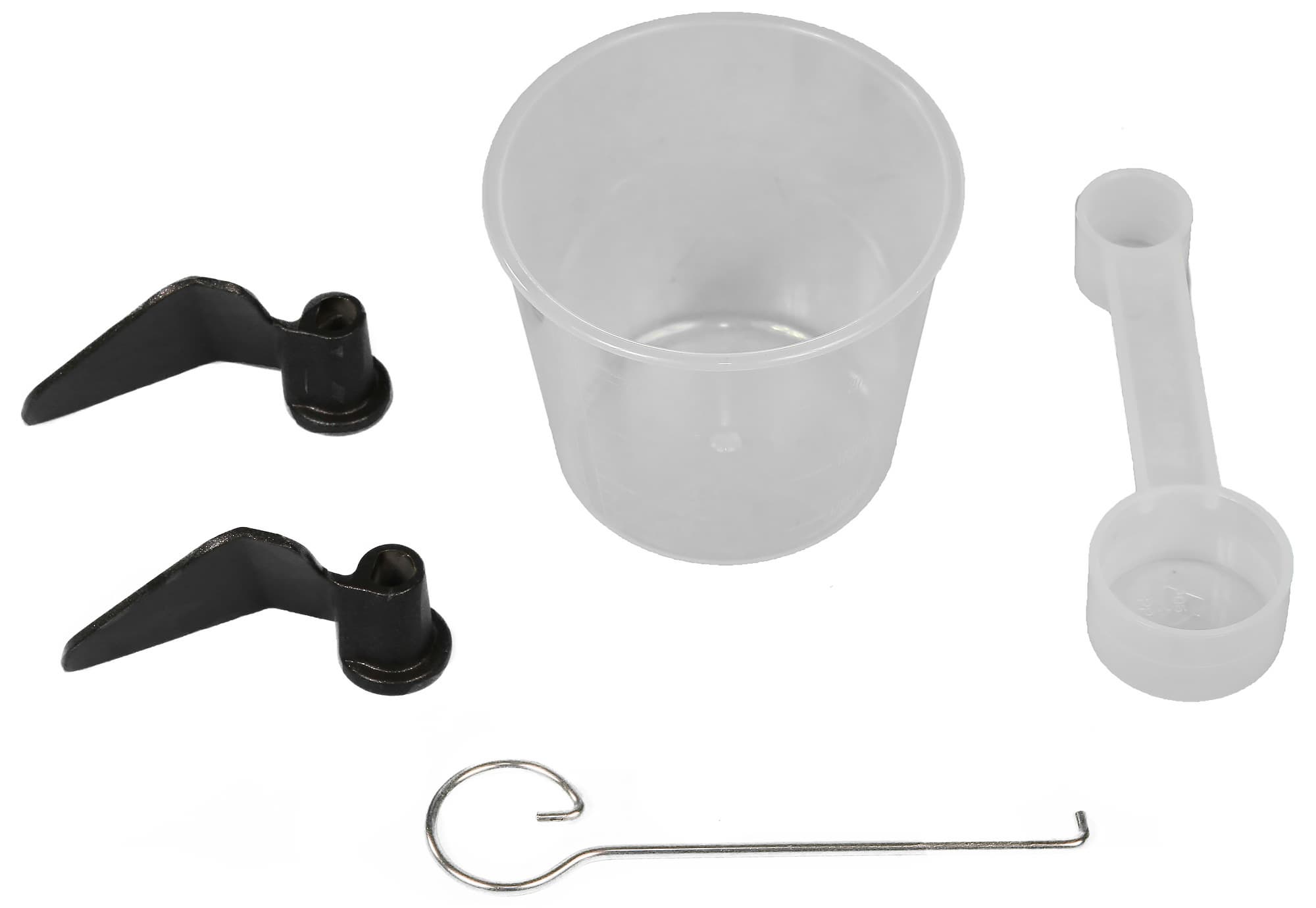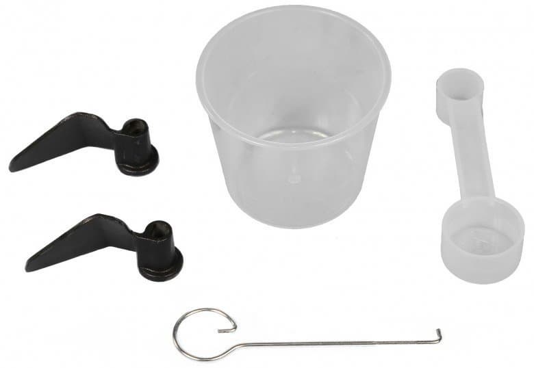 Мерная ложка и стакан, входящие в комплект, пригодятся в случае, если у пользователя не оказалось под рукой кухонных весов. Крюк для извлечения лопастей понадобится для извлечения лопасти из готовой выпечки: с его помощью можно извлечь лопасть прямо из горячего хлеба, не нарушив его форму (это гораздо удобнее, чем ковыряться в хлебе ножом или другим подручным предметом).