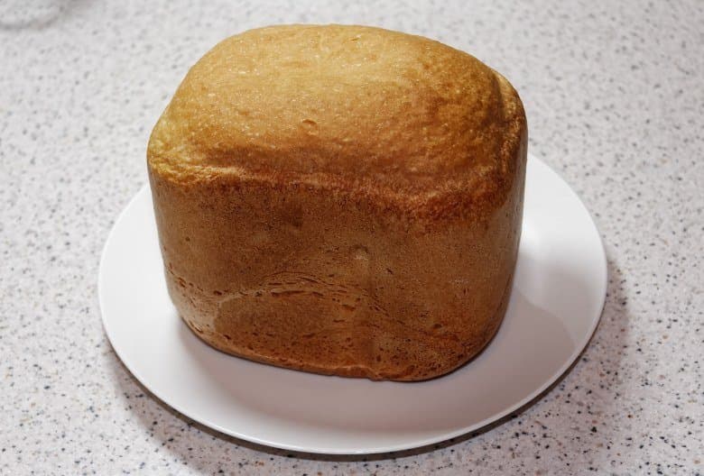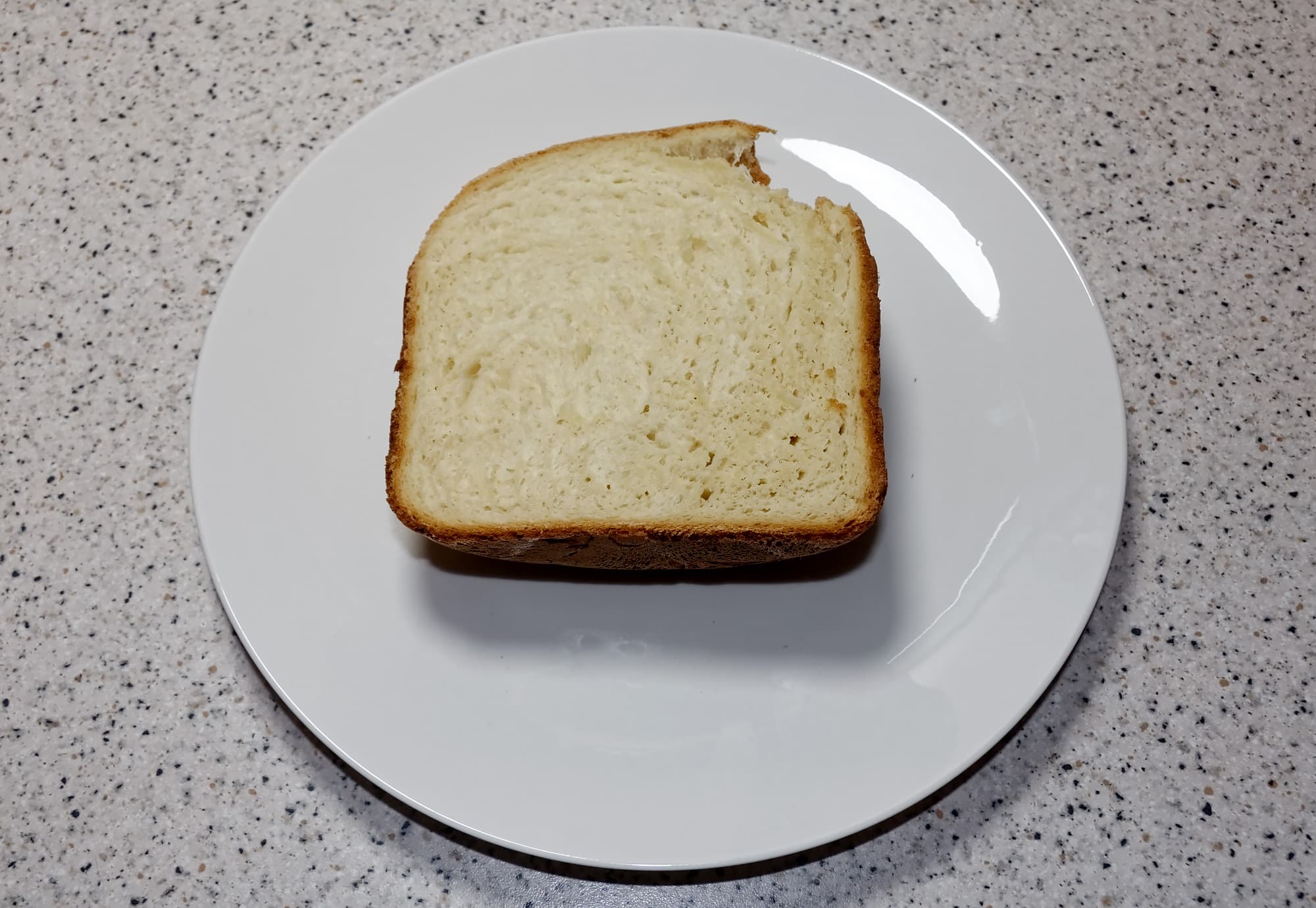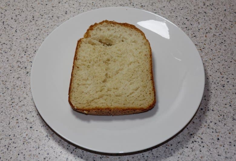 Наш хлеб получился довольно тяжелым и плотным, но при этом нисколько не сырым и очень вкусным. По консистенции он больше всего напоминал хлеб-полуфабрикат для тостов (тот, который требуется «допекать» в электрической бутерброднице), но, конечно же, наш хлеб впоследствии допекать не требовалось. Все, что нам осталось сделать — извлечь его из чаши и достать из буханки лопасть для замешивания с помощью специального крючка.