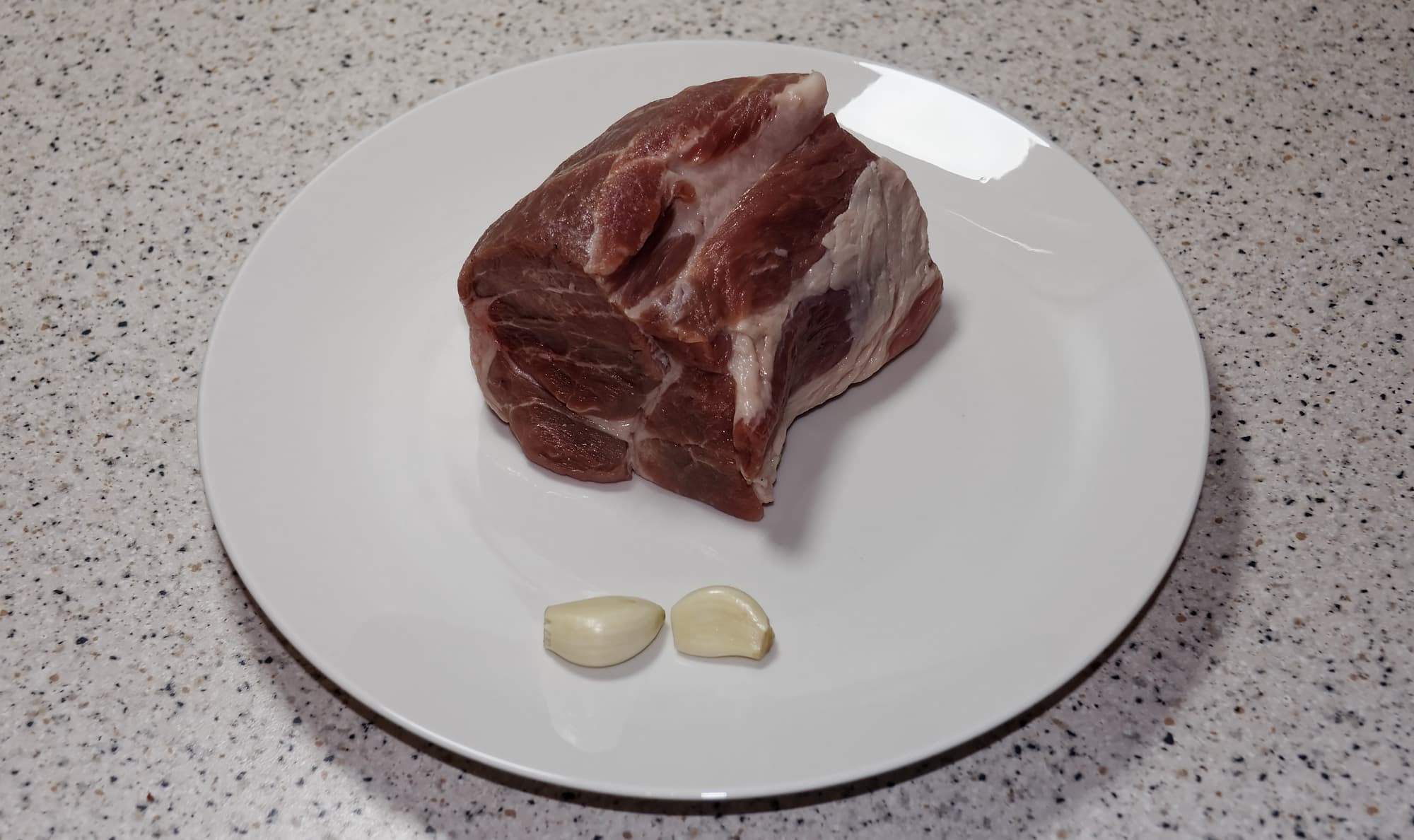 Кусок свинины весом около 500 г нужно натереть солью и специями и положить в чашу (мы добавили пару зубчиков чеснока для вкуса).