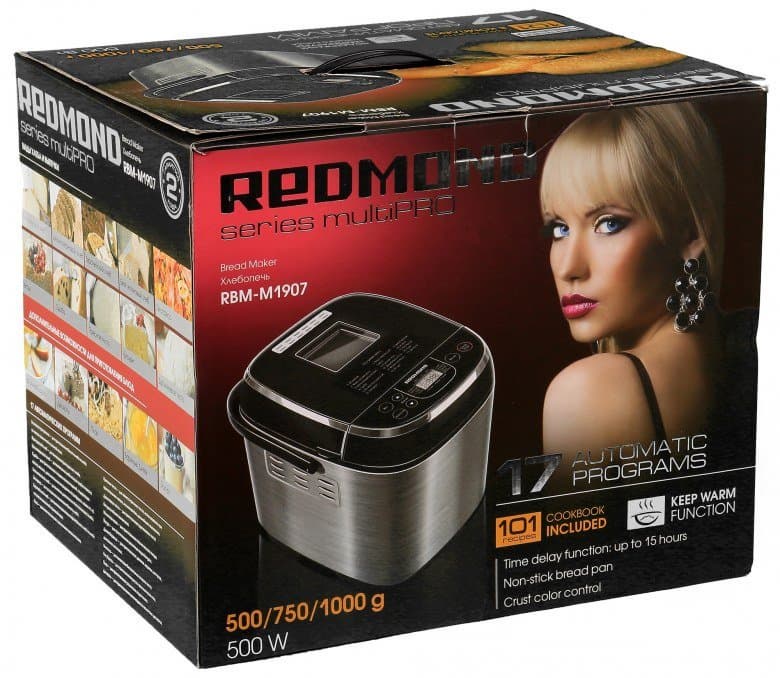 Коробка оформлена с использованием полноцветной печати. Дизайн упаковки — стандартный для Redmond: фото с симпатичной девушкой, изображение хлебопечи, фотографии с примерами готовых блюд и сопутствующая информация.