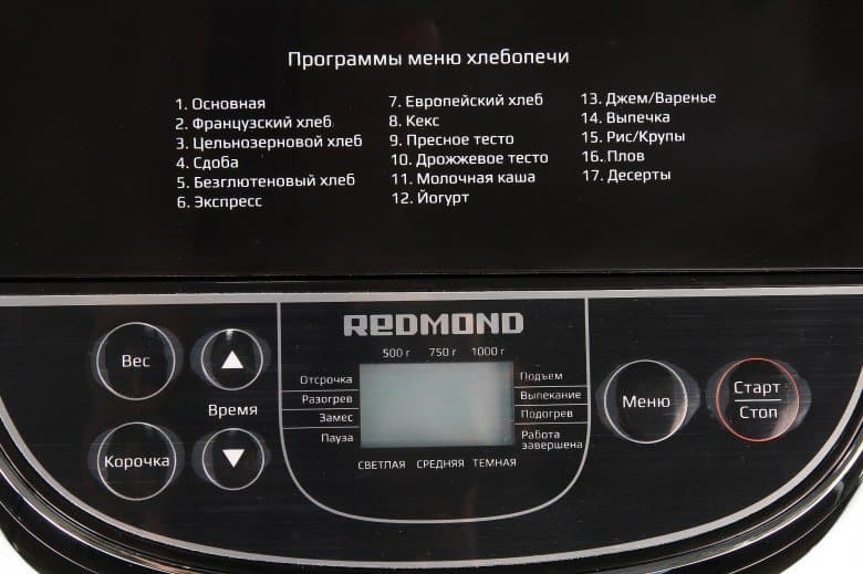 Управление хлебопечью осуществляется с помощью шести механических мембранных кнопок. Обратная связь с пользователем осуществляется с помощью черно-белого ЖК-дисплея (к сожалению, подсветки у него не предусмотрено).