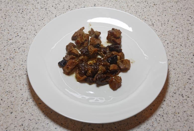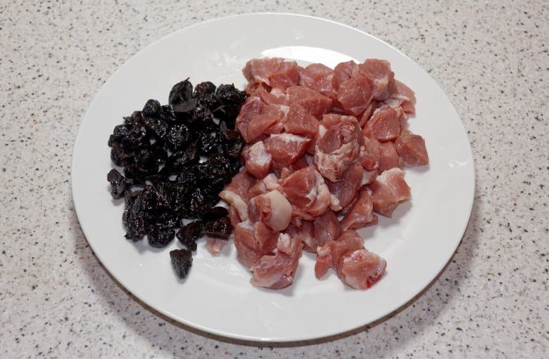 Для этого блюда нам потребуется 400 г свинины (шея), 100 г чернослива, 150 мл воды, соль и специи.