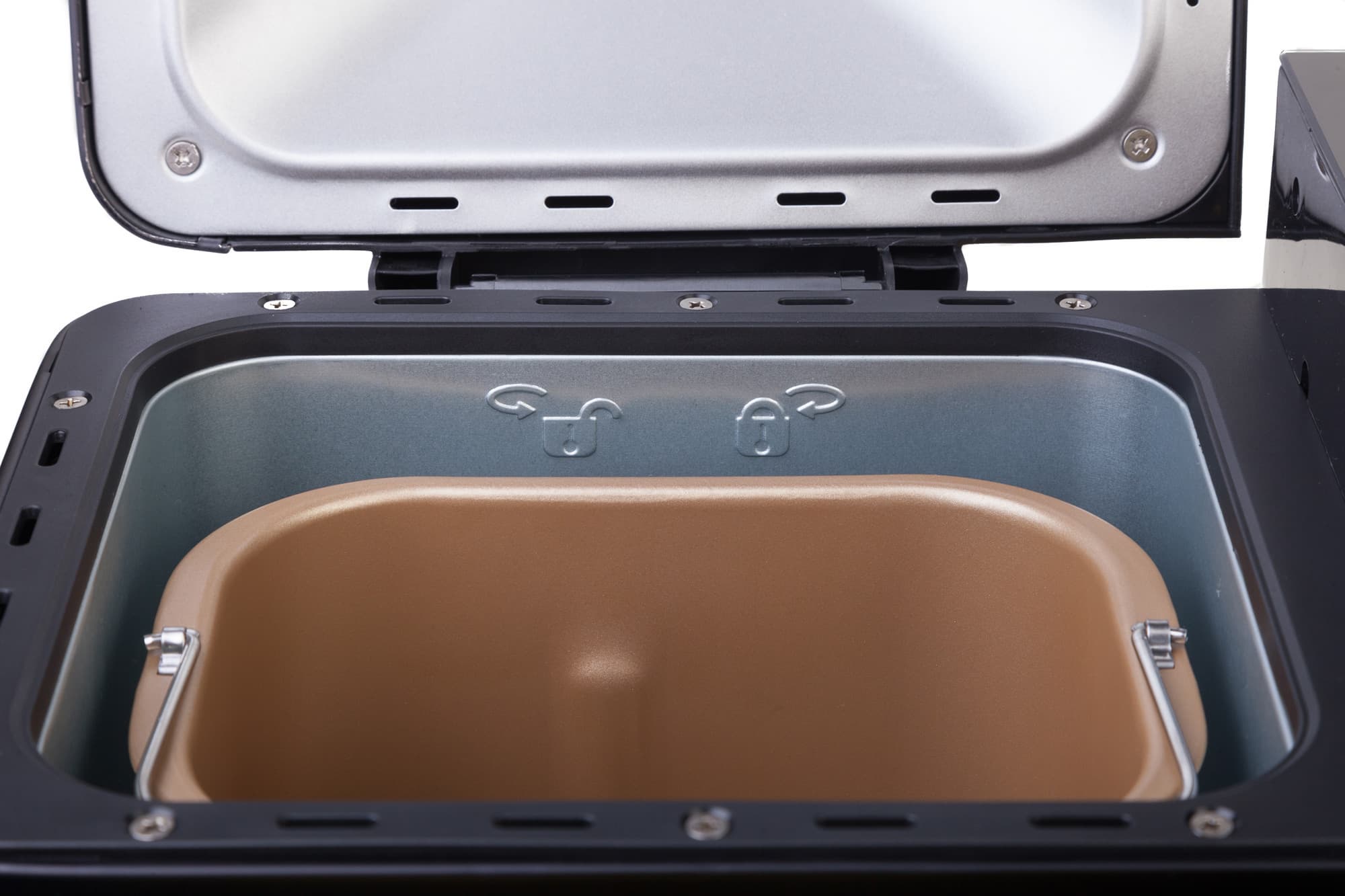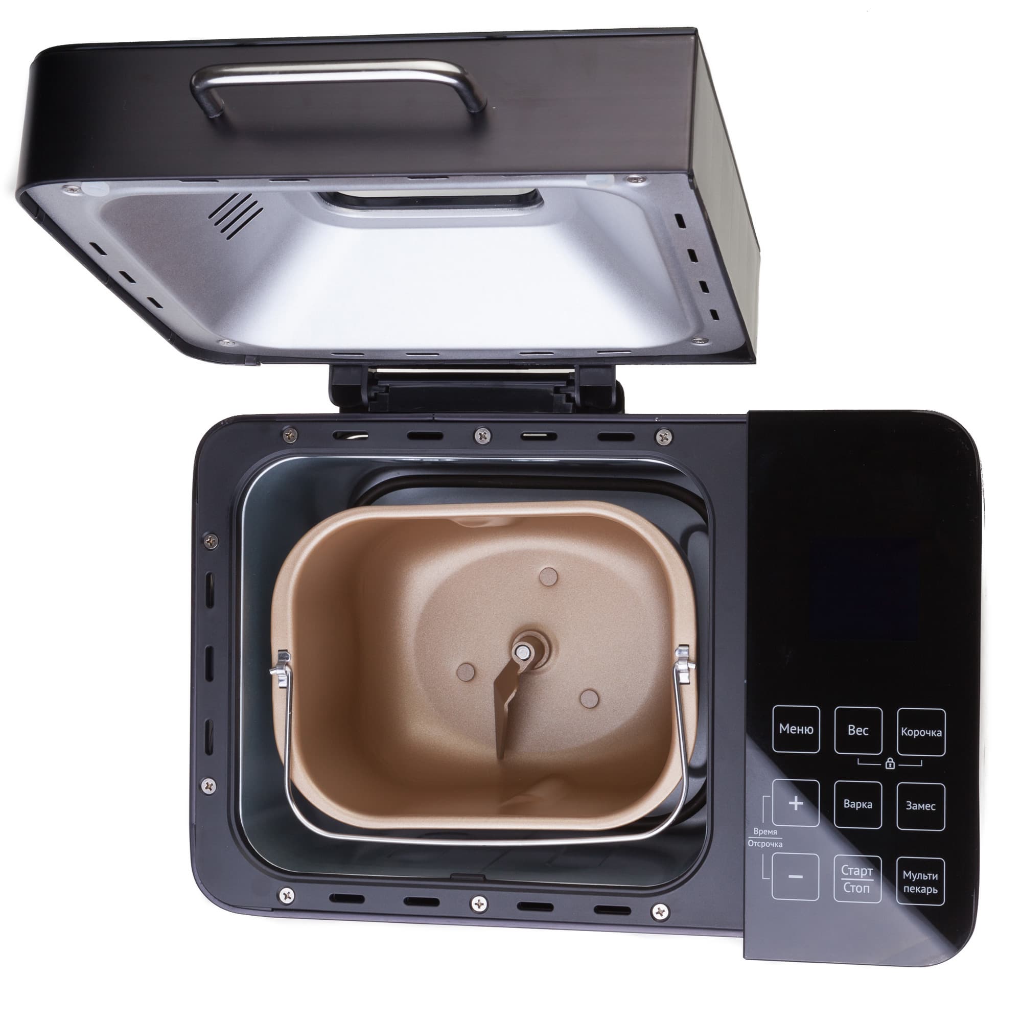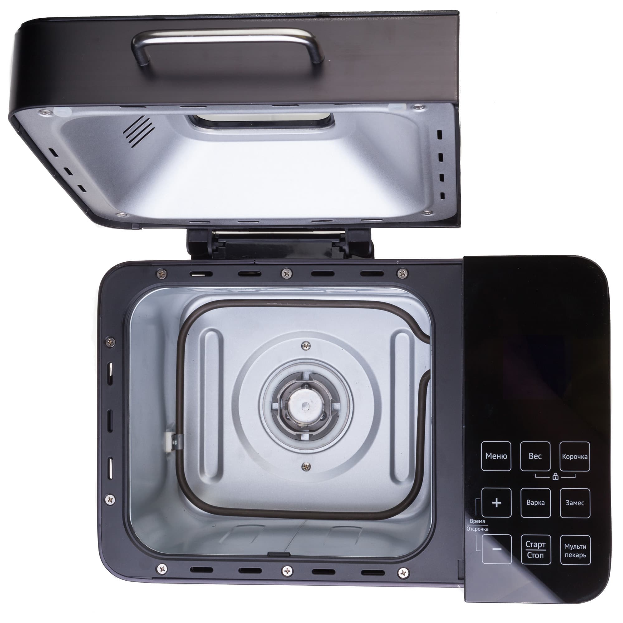Крышка открывается с помощью ручки, которая не нагревается ни на каком из этапов выпечки.