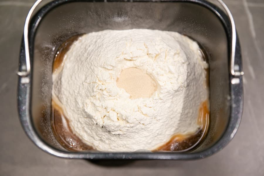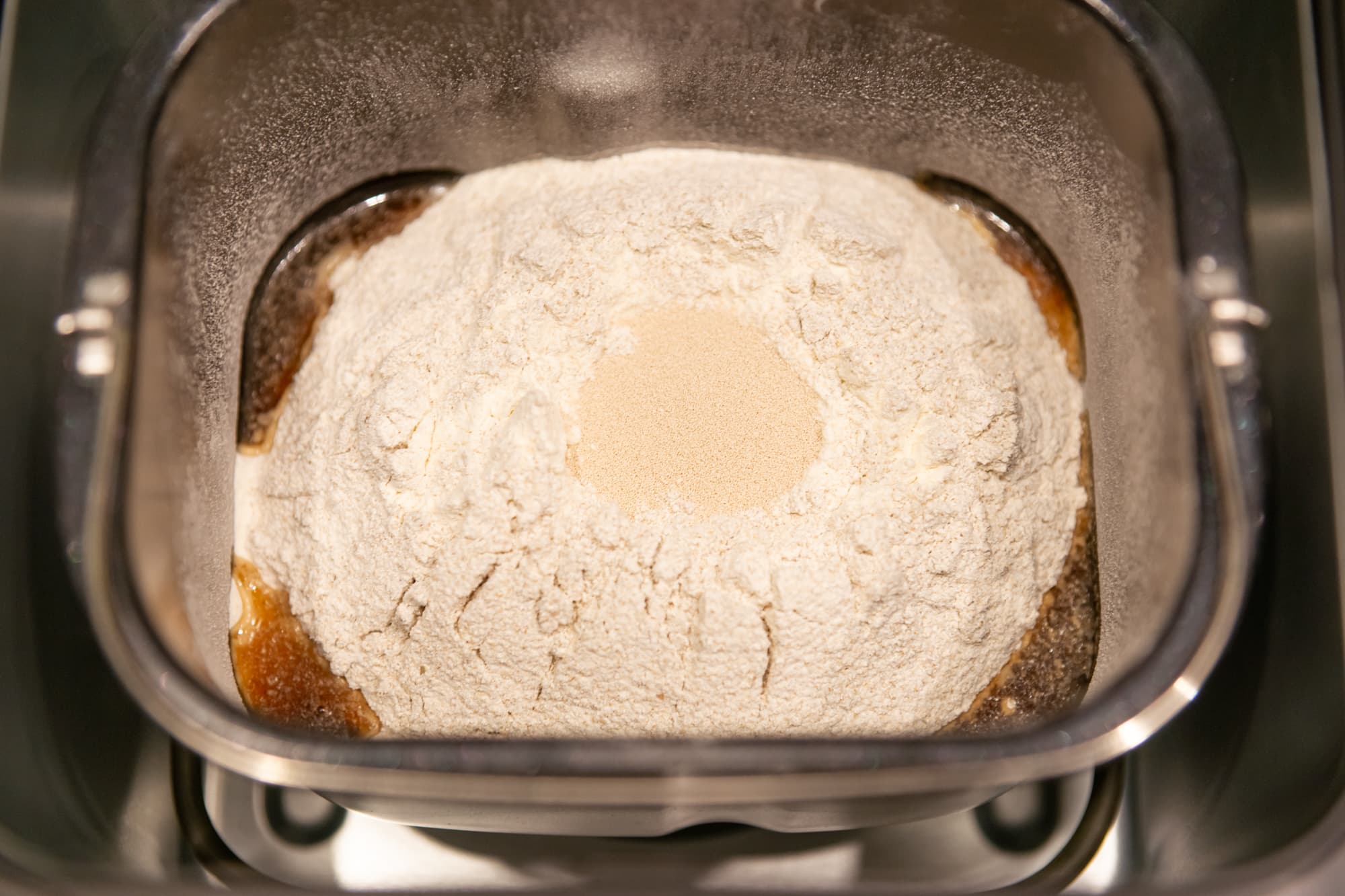 В чашу хлебопечки отправились ингредиенты в следующем порядке: вода, растительное масло, сахар, соль, просеянная пшеничная мука и сухие быстродействующие дрожжи.