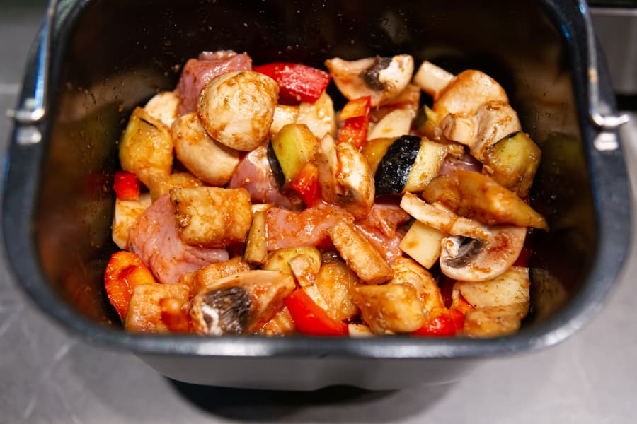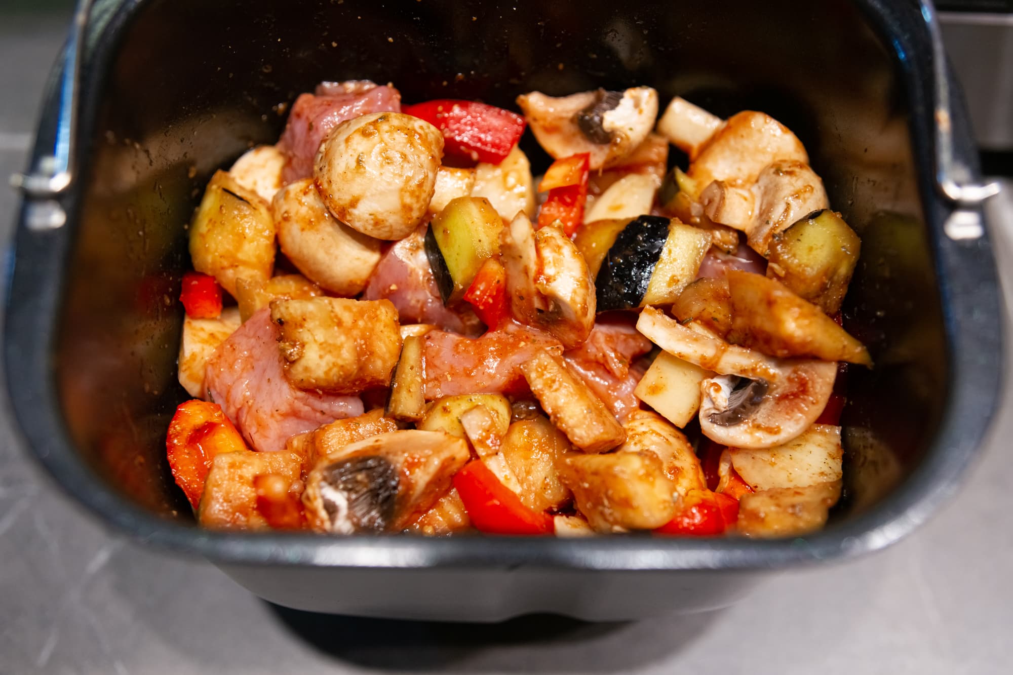 Для проверки программы, не относящейся к выпечке, из комплектной книги мы взяли рецепт №78. Вынули лопасть и поместили в чашу нарезанные кубиками свинину, картофель, баклажаны, затем болгарский перец и шампиньоны. Добавили разведенную в 200 мл воды томатную пасту, специи, соль, растительное масло и перемешали.