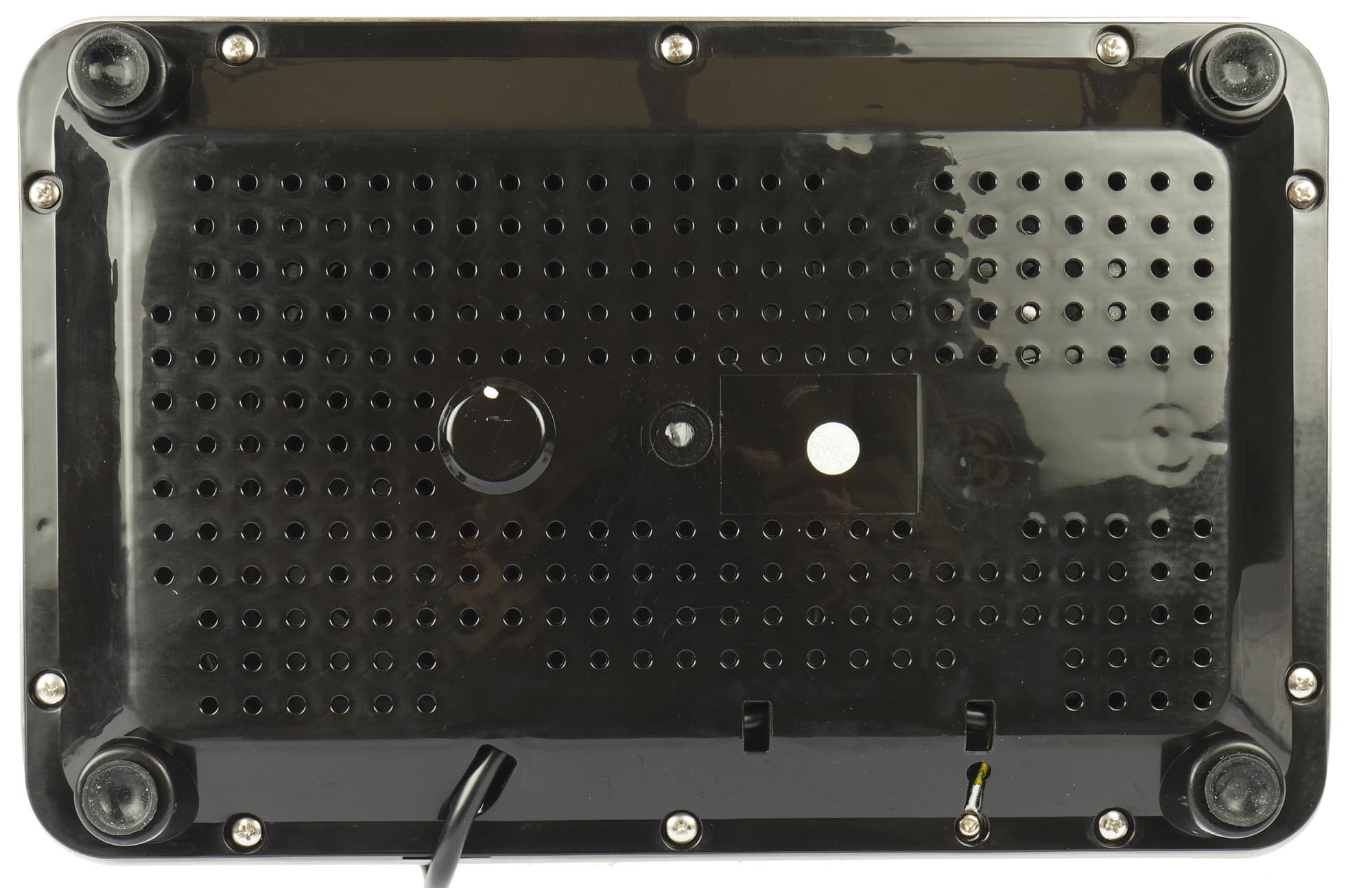 Хлебопечь крепко держится на поверхности стола благодаря четырем ножкам с присосками. Кроме них на дне есть вентиляционные отверстия и место крепления шнура электропитания.