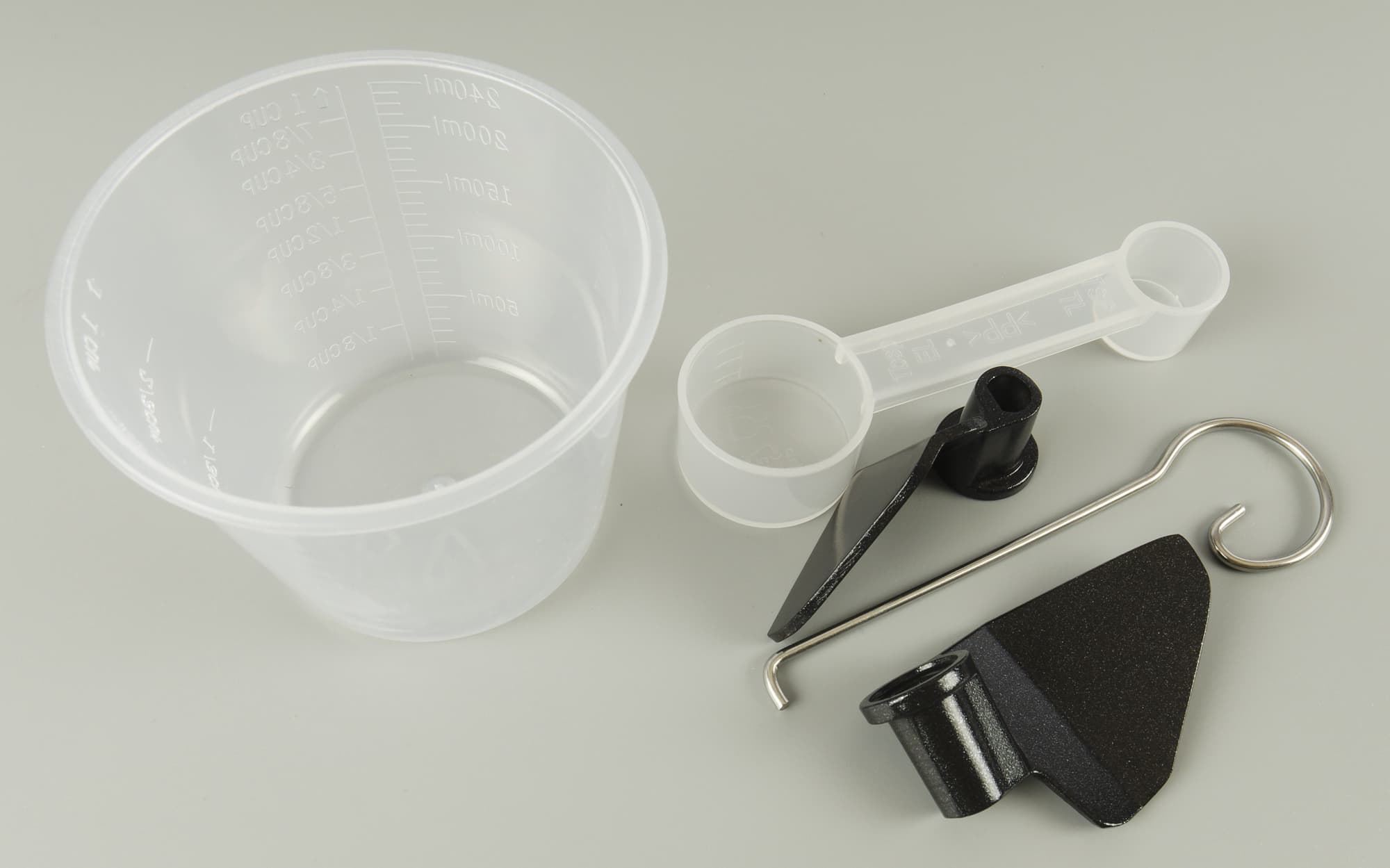 Стандартный комплект аксессуаров включает в себя: мерный стакан, мерную ложку, две лопасти для замешивания теста (одна запасная) и крюк для извлечения лопасти.