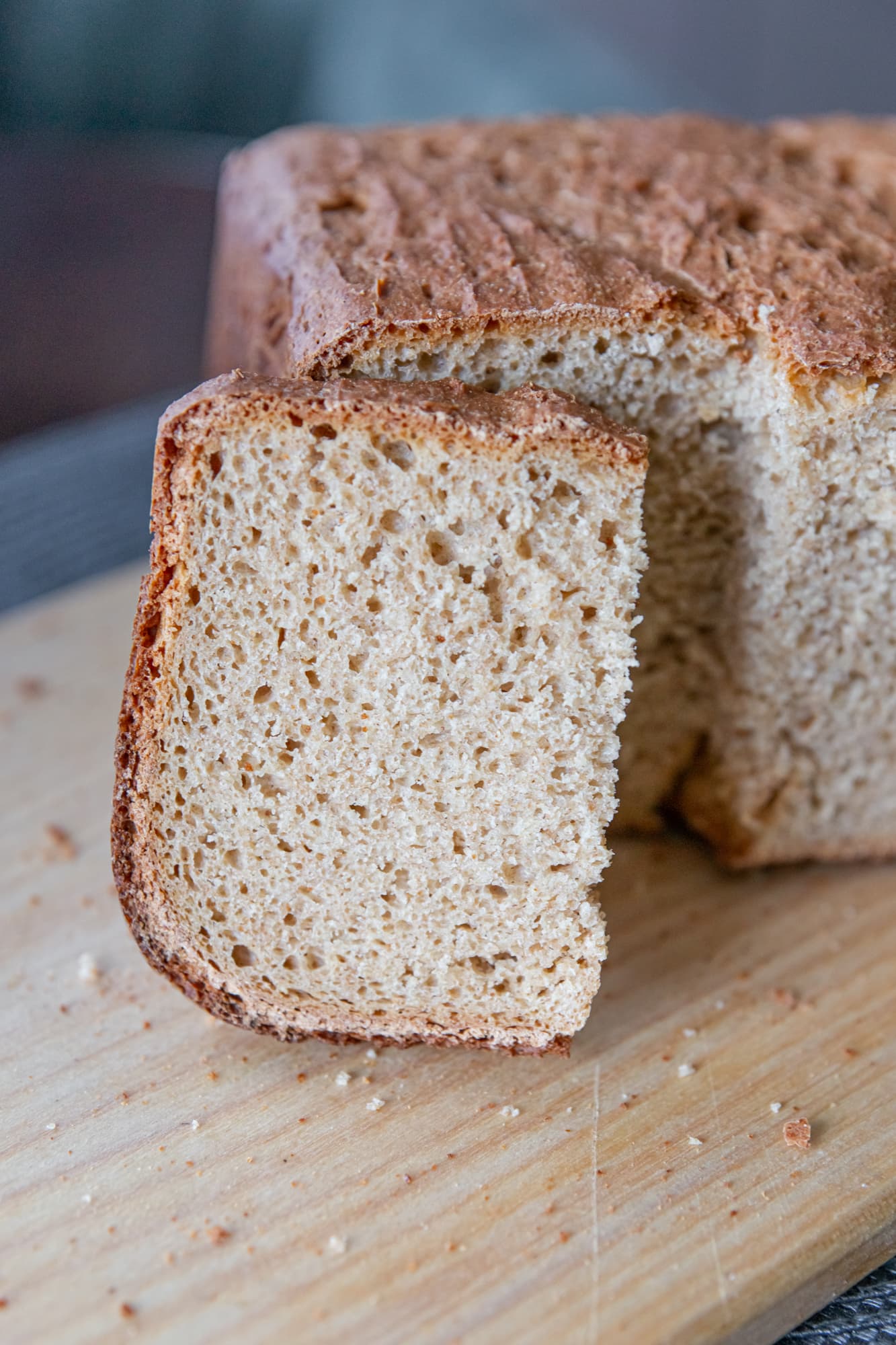 Тем не менее, буханка внутри вышла отличной — мякиш получился среднепористый, при сжатии быстро восстанавливающий форму. Корочка со всех сторон запеклась равномерно, снова ничего нигде не подгорело. При нарезке немного крошилась только корочка.