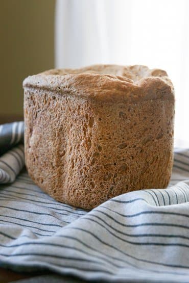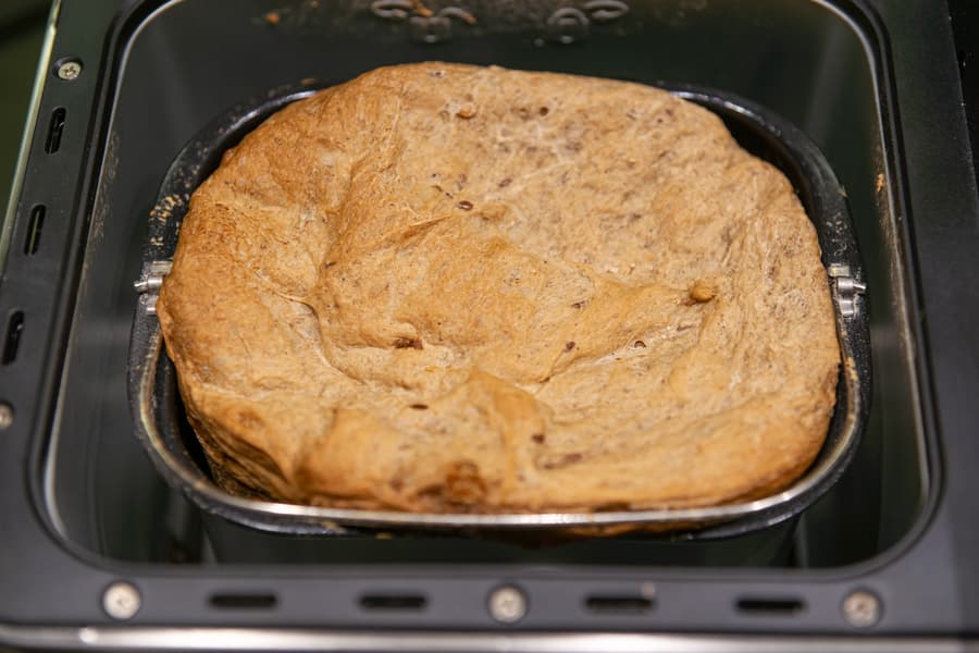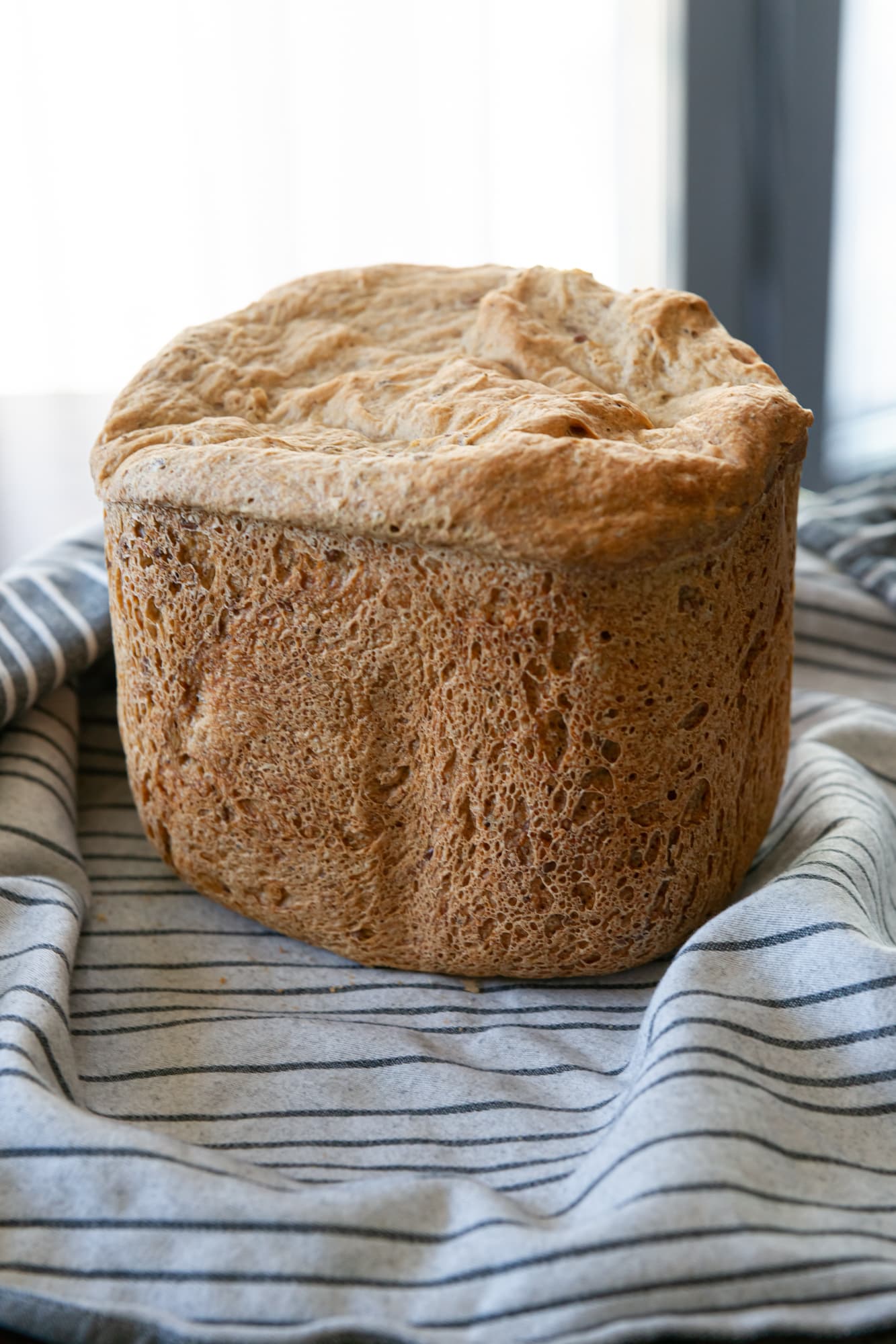 Для четвертого хлеба мы взяли готовую смесь, содержащую цельнозерновую муку, семена подсолнечника и тыквы, плющеный овес и пшеничные отруби. Высыпали в емкость хлебопечки просеянную смесь, добавили к ней необходимое количество воды, растительного масла и сухих дрожжей. Установили программу №3 (Цельнозерновой хлеб), вес буханки — 1000 г, цвет корочки — светлый. Длительность программы с таким настройками составила 4 часа 5 минут. Во время выпекания мы поглядывали в окошко, верхушка была ровной и сильно поднялась достав до самой крышки. К концу цикла она сдулась и опала.