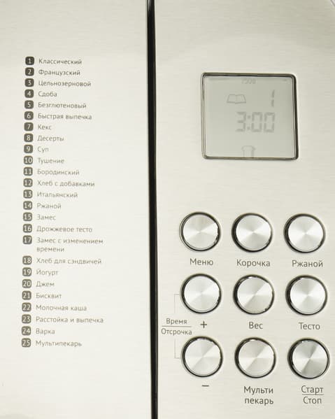 Дисплей показывает выбранные установки, а в процессе приготовления отображает остаток времени до окончания цикла и информацию о текущем этапе. Это может быть отсрочка старта, замес, отдых, подъем, выпечка или автоподогрев.