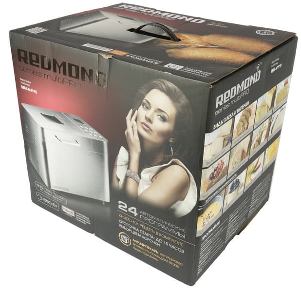 Хлебопечь упакована в большую красивую коробку оформленную в фирменном стиле Redmond. На черном фоне с красным градиентом изображено само устройство, размещена информация о нем, а на боковых гранях примеры блюд приготовленных с его помощью. Упаковка достаточно информативна, чтобы составить первое впечатление о приборе и ознакомиться с его особенностями. Сверху предусмотрена ручка для переноски.