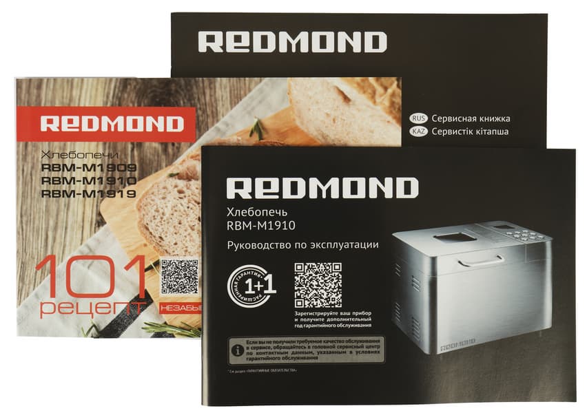 В комплект Redmond RBM-M1910 входит красочная книга рецептов. Первые страницы глянцевого мини-журнала отведены под рекламу, далее следуют общие сведения о хлебопечке, с советами поваров компании, рекомендациями по приготовлению и таблицами калорийности продуктов. Дальше, самое интересное — 101 рецепт. Первые 48 посвящены выпечке хлеба, остальные помогут приготовить сладкую выпечку, супы, вторые блюда и десерты. В каждом рецепте есть перечень ингредиентов, порядок приготовления и фотография готового блюда. Книга будет полезна и, как минимум интересна, как для начинающего, так и для продвинутого пользователя.