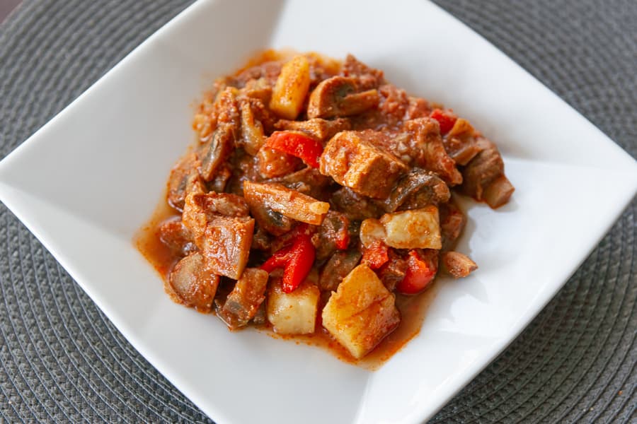 Ингредиенты: свинина (филе) — 250 г, картофель — 200 г, баклажаны — 200 г, перец болгарский — 150 г, шампиньоны — 100 г, паста томатная — 60 г, масло растительное — 20 мл, вода — 200 мл, соль, специи