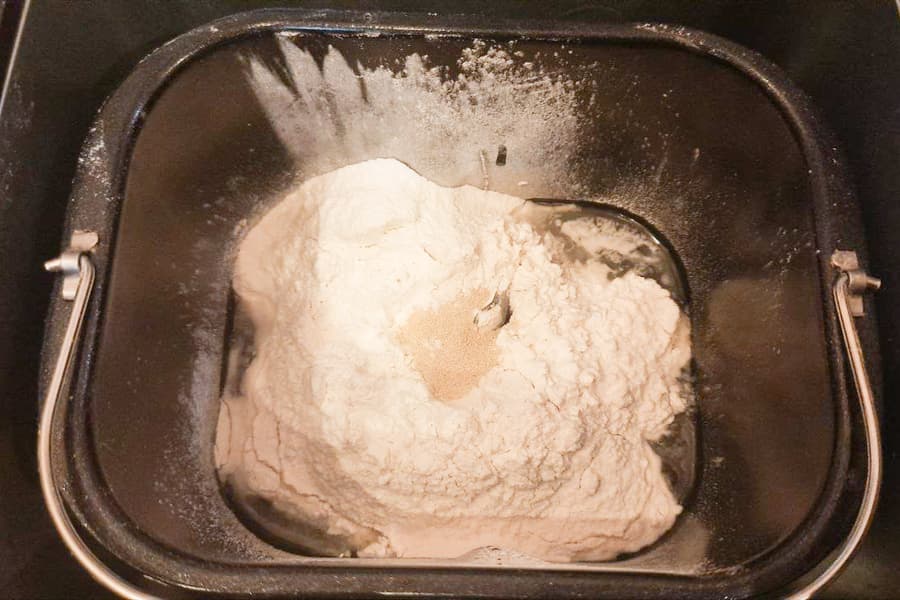 Ингредиенты: мука пшеничная — 225 г, мука ржаная — 250 г, соль — 10 г, сахар — 25 г, молоко — 380 мл, масло растительное — 10 мл, сухие дрожжи — 7 г