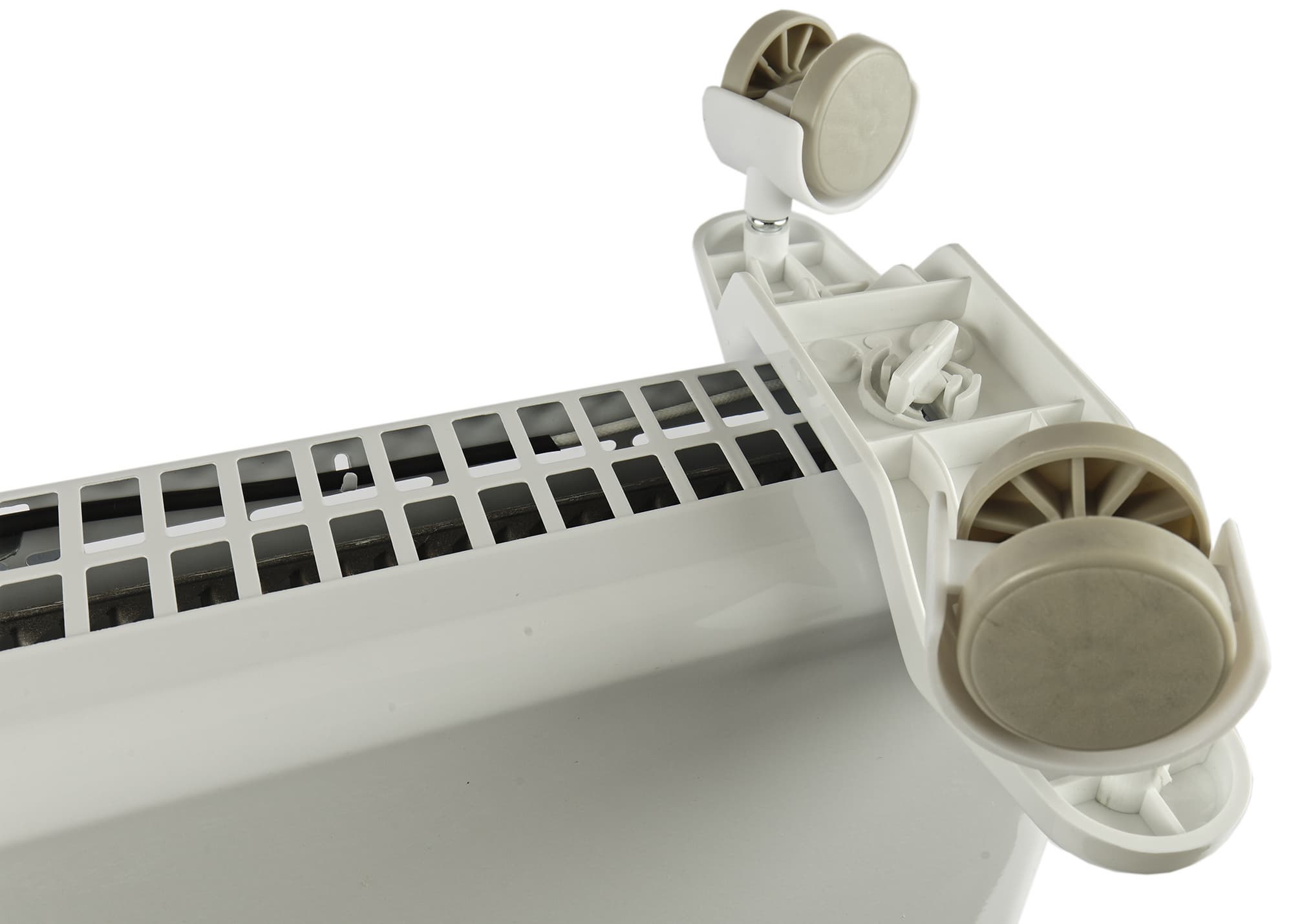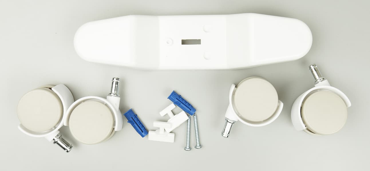 Конвектор поставляется в разобранном виде, отдельно корпус, отдельно крутящиеся колеса и крепеж. Для сборки не нужен инструмент, да и сама сборка труда не составляет и занимает пару минут. При желании конвектор может быть закреплен на стену — в комплекте есть дюбеля и шурупы, тогда колеса крепить к корпусу не нужно.