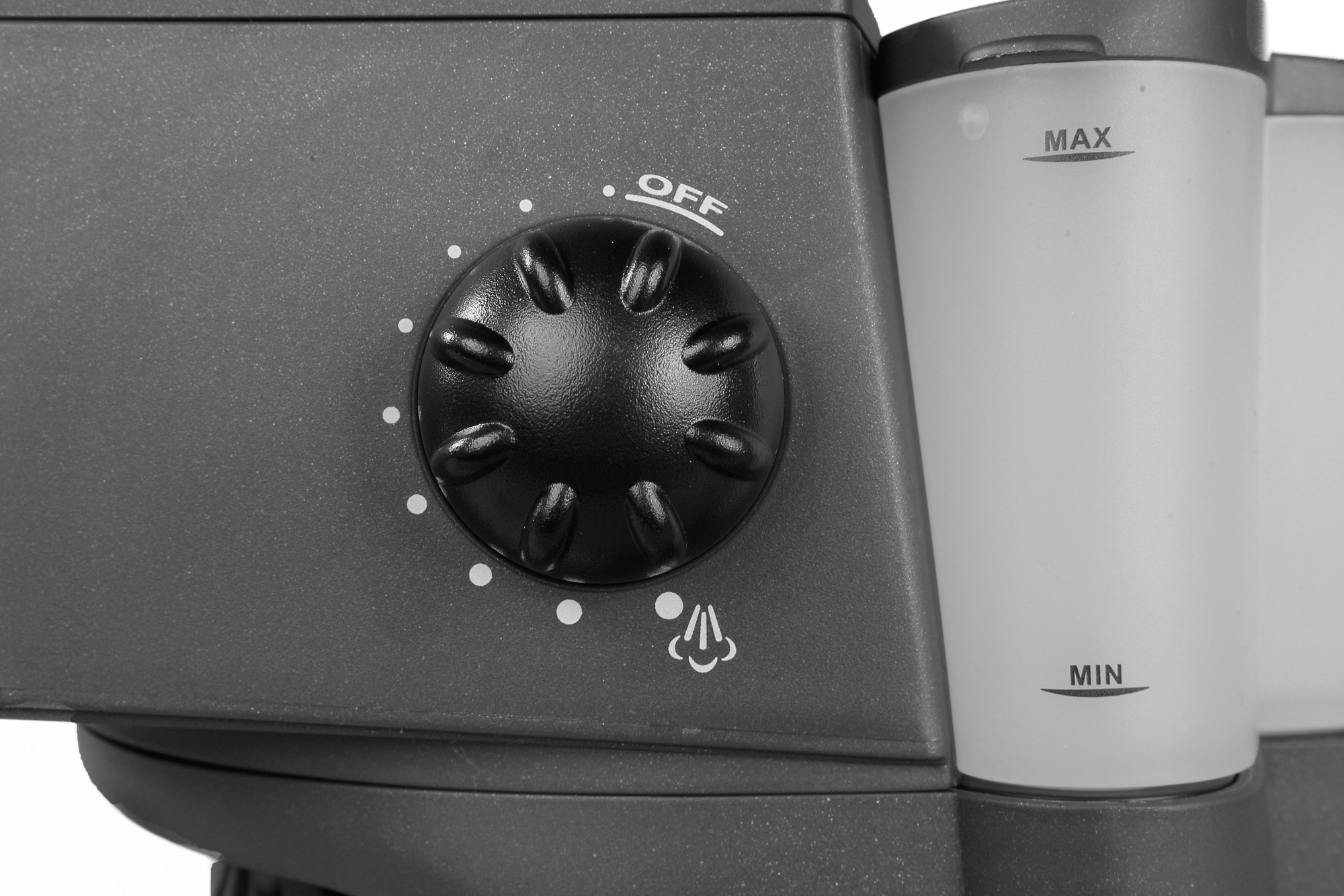 Сопло капучинатора представляет собой металлическую трубку с насадкой, сделанной из металла и пластика. Насадка съемная: она надевается на трубку с небольшим усилием и точно так же легко снимается. В пластиковой части имеются дополнительные отверстия для выхода пара. На правой стенке прибора расположена ручка подачи пара, позволяющая регулировать интенсивность работы капучинатора.