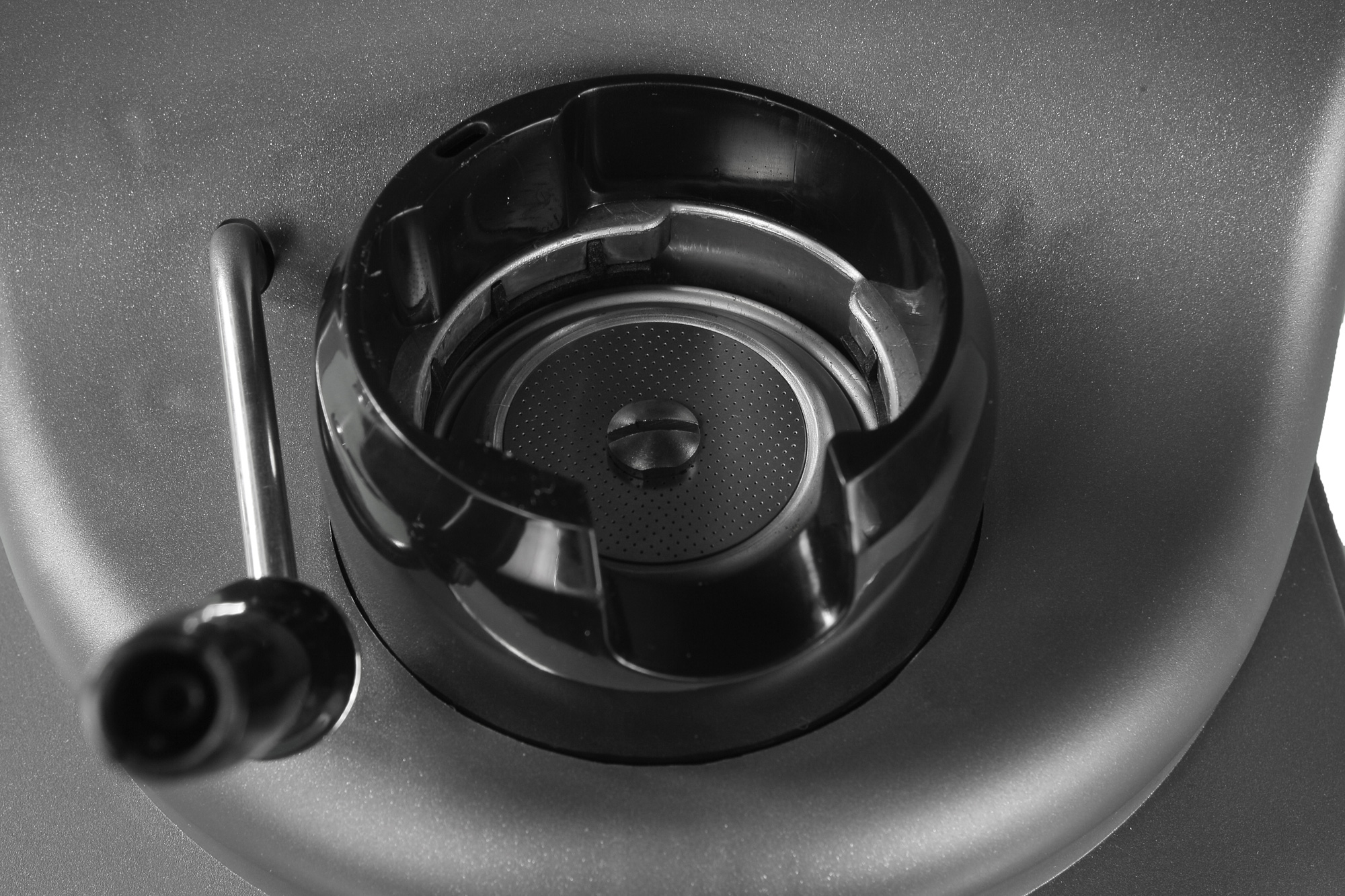 Байонет для установки рожка закрыт дополнительным пластиковым колпачком, который поворачивается вместе с рожком и имеет специальное углубление, подсказывающее пользователю правильную ориентацию рожка во время его установки. На наш взгляд, подобное решение является излишним, хотя если рассматривать его в качестве элемента дизайна — почему бы и нет. Металлический рожок выглядит, как довольно увесистый «бочонок»: внутри расположена специальная система, сохраняющая давление на протяжении всего процесса приготовления кофе (на коробке нарисована некая конструкция с пружинками). На внутренней стенке рожка нанесены риски, соответствующие одинарной и двойной порции кофе. Сам рожок устанавливается и поворачивается с ощутимым усилием.