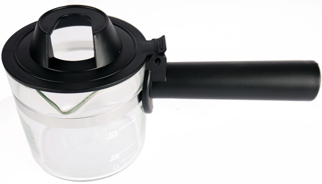 Небольшой стеклянный кувшин объемом 350 имеет откидную крышку (с кнопкой под большой палец). Сбоку на стекле нанесена градуировка — 2 и 4 чашки, а также значок пара — чтобы отмерить небольшой объем воды для вспенивания молока.
