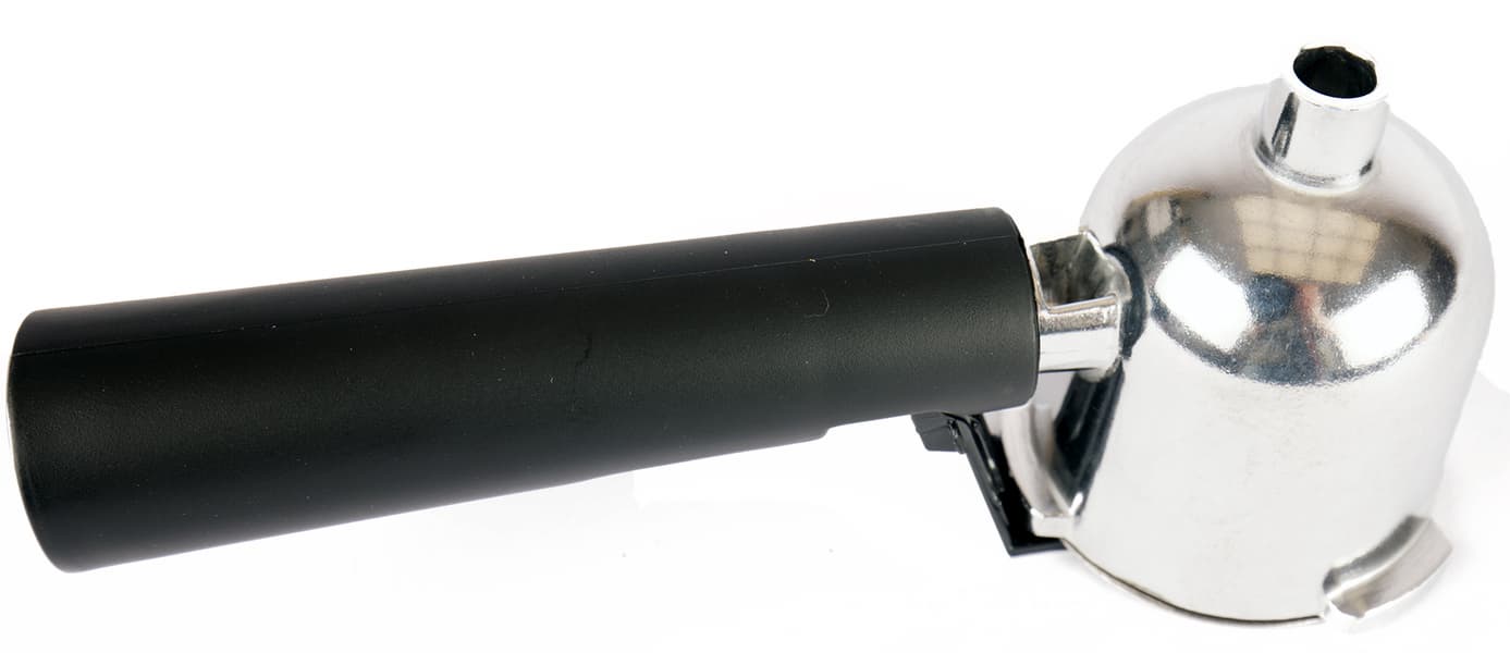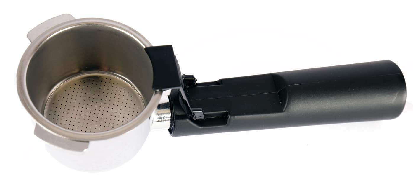 Рожок весом чуть более 130 граммов сделан из белого металла (снова силумин?). Материал фильтра похож на нержавеющую сталь. У рожка имеется откидной держатель для фильтра, позволяющий вытряхивать кофе прямо в мусорную корзину.