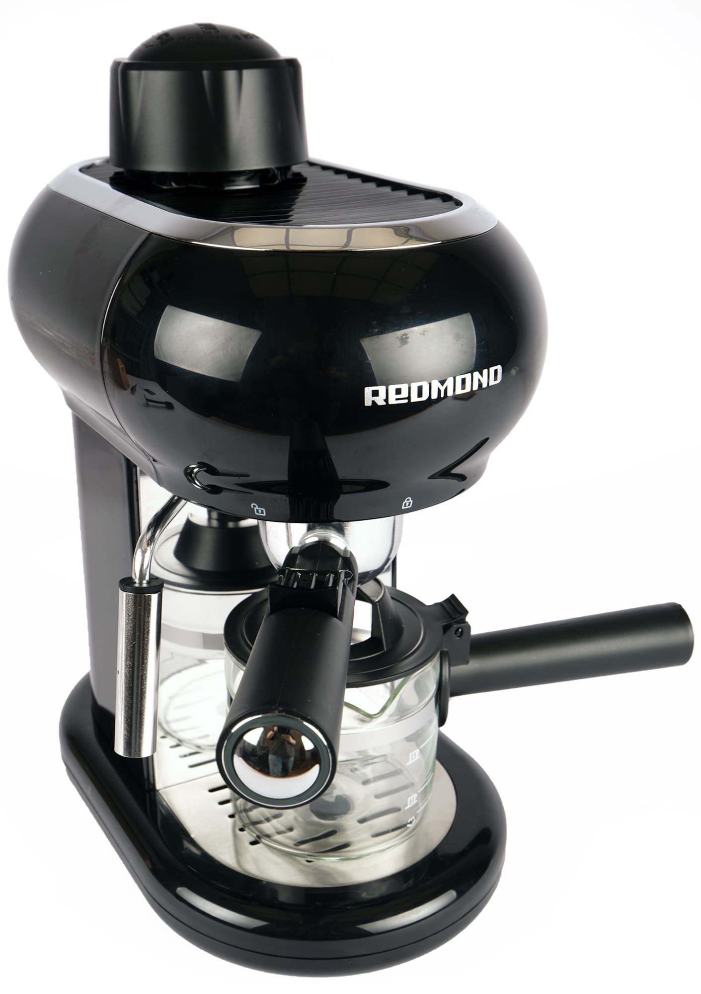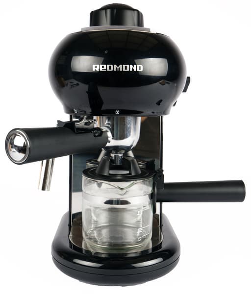 Redmond RCM-1521 представляет собой знакомый нам тип кофеварок, оснащенных рожком, но не имеющих помпы. Таким образом, прибор сочетает в себе черты капельной кофеварки (имеет кувшин и готовит напиток при низком давлении) и рожковой (оснащен рожком с фильтром, через который проливается вода). В нашей тестовой лаборатории уже бывали подобные устройства (например, Redmond RCM-1524), поэтому, приступая к тестированию, мы в целом мы уже представляли, чего ждать.