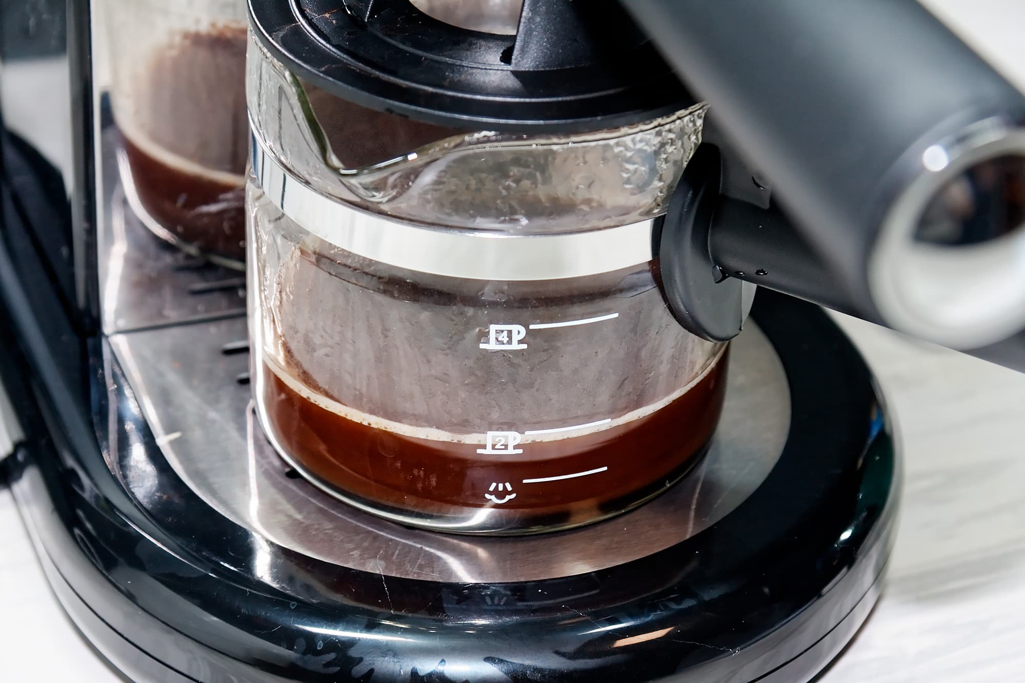 Кофе начал поступать в кувшин через 1 минуту 5 секунд, общее время приготовления составило примерно 1 минуту 45 секунд. Температура напитка в кувшине составила 70 °C.