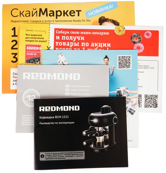 Кофеварка поставляется в картонной коробке, оформленной в фирменном стиле Redmond. Мы увидим хорошо знакомый стиль: фирменные шрифты, строгую цветовую гамму, фотографии самого прибора и описание его основных технических характеристик. Благодаря такому оформлению потенциальный покупатель не только сразу же узнает продукцию Redmond на полках магазинов, но также сможет составить первое впечатление о приборе, не вскрывая коробку.