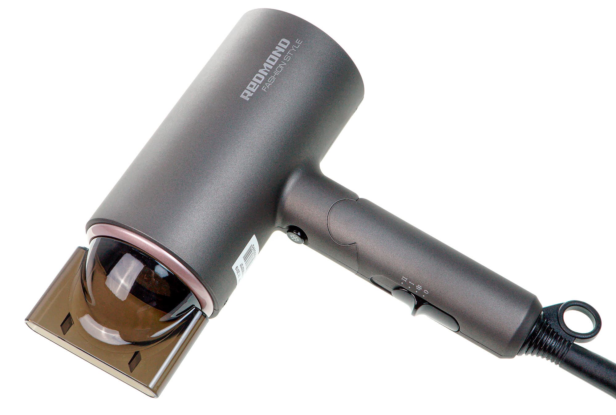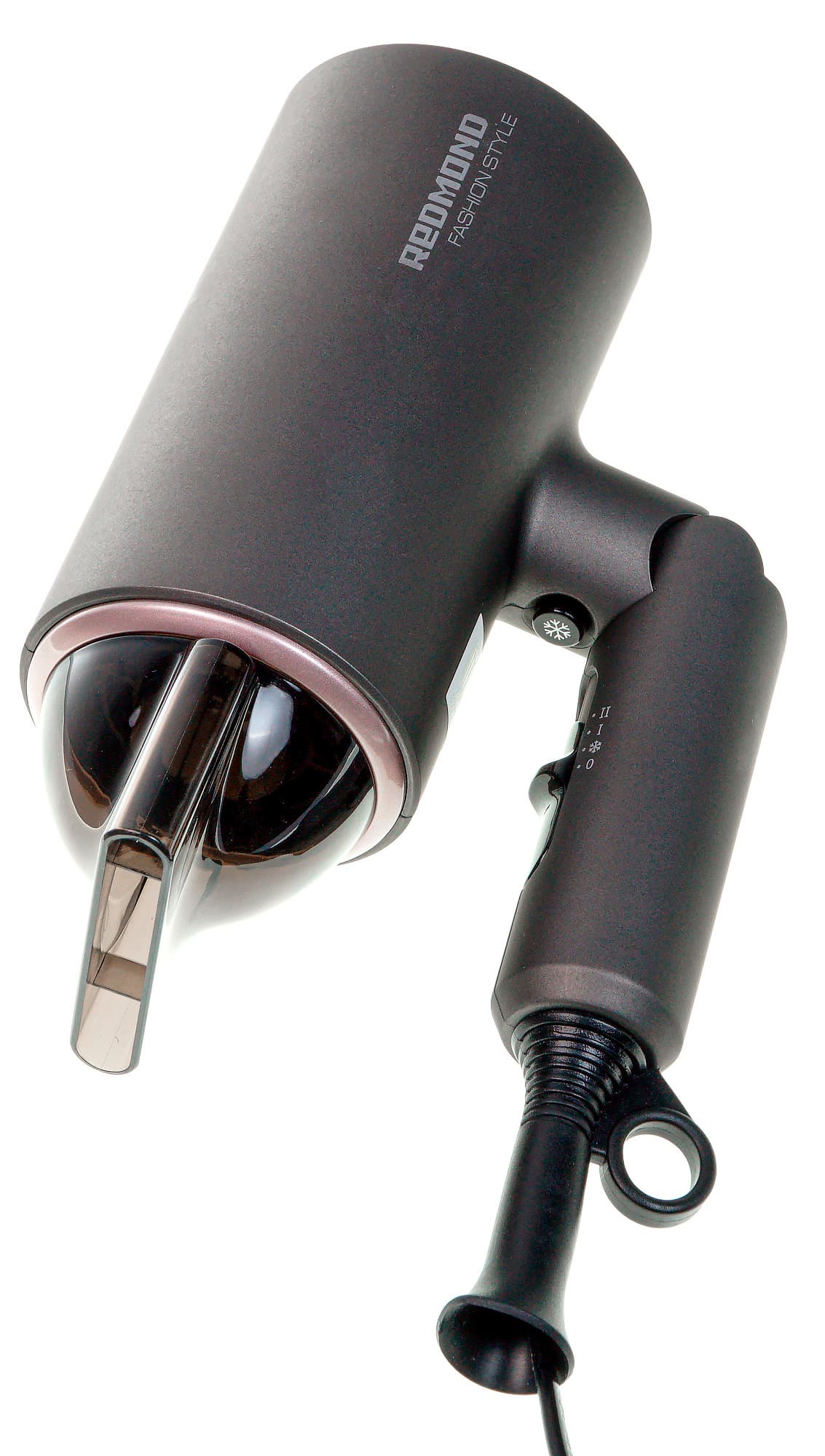 Фен Redmond RF-534 оснащен насадкой-концентратором — единственной действительно нужной, по нашему мнению, насадкой. Выполнена деталь из прозрачного затемненного пластика, имеет, в целом, стандартную форму. Для крепления на корпусе необходимо совместить ее края со вставкой по периметру сопла и надавить до легкого щелчка. Снимается концентратор, если за него потянуть. Жестко на корпусе не фиксируется, по окружности вращается с определенным усилием, не скользит.