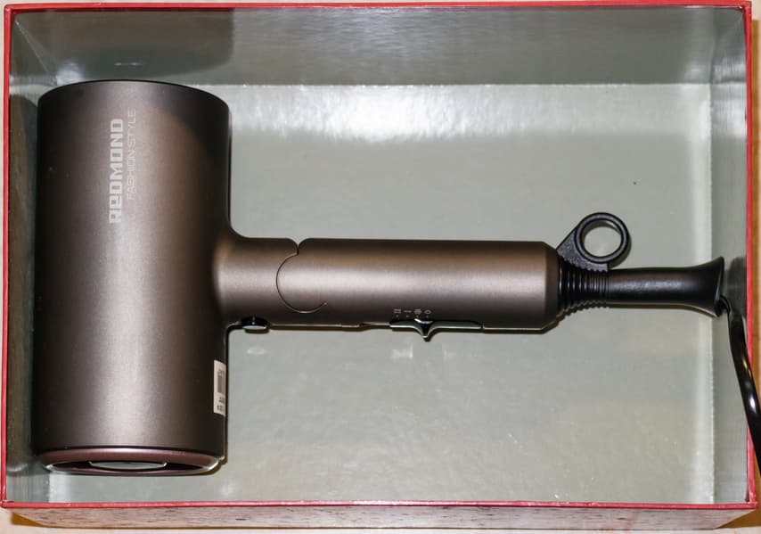 Визуальный осмотр компактного фена Redmond RF-534 оставил лишь один вопрос: как конструкция прибора, в частности большой диаметр выходного сопла, повлияет на скорость воздушного потока? Во всем остальном прибор достаточно стандартен. Никаких недостатков в качестве изготовления или сборки не обнаружено.