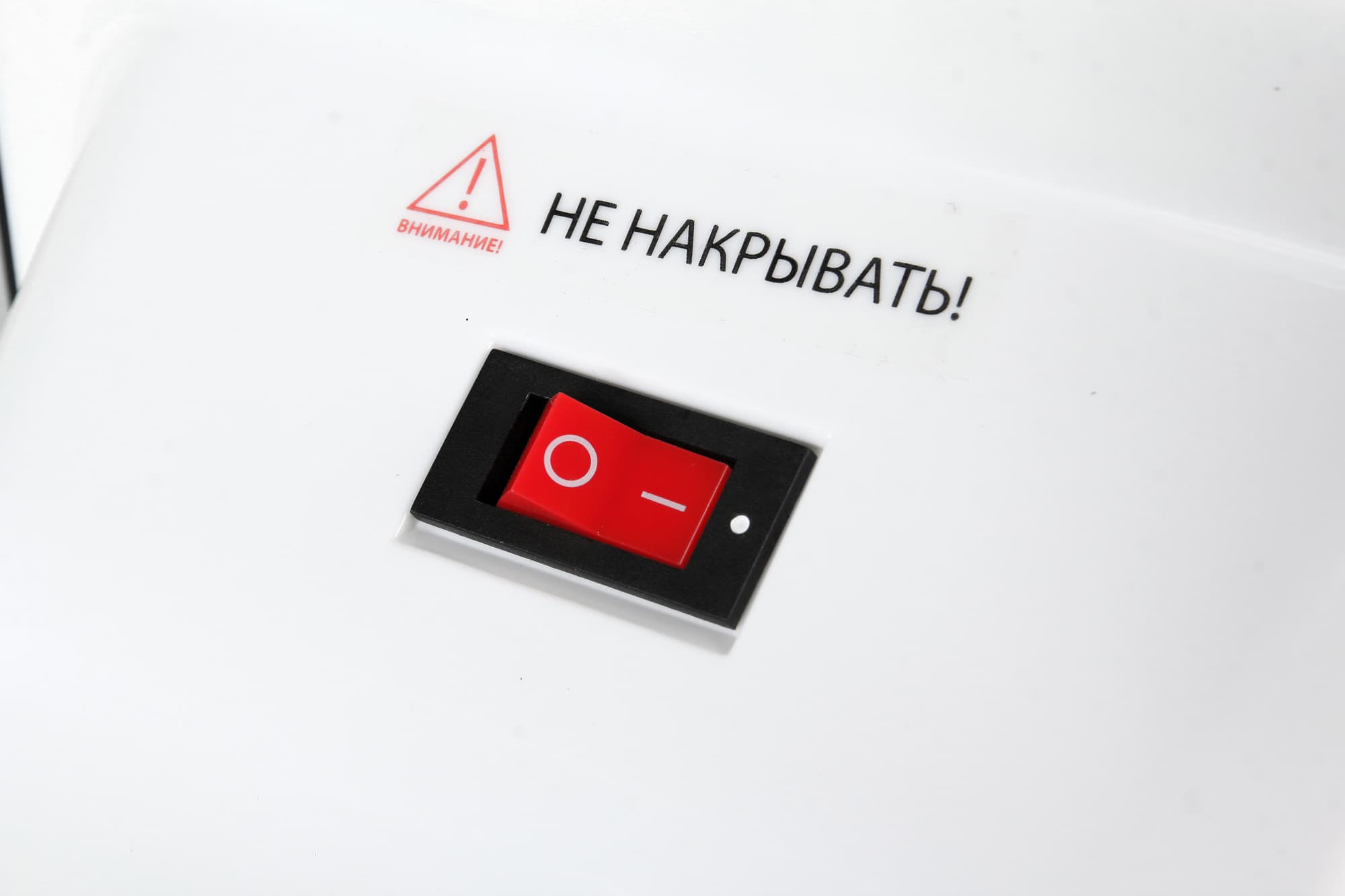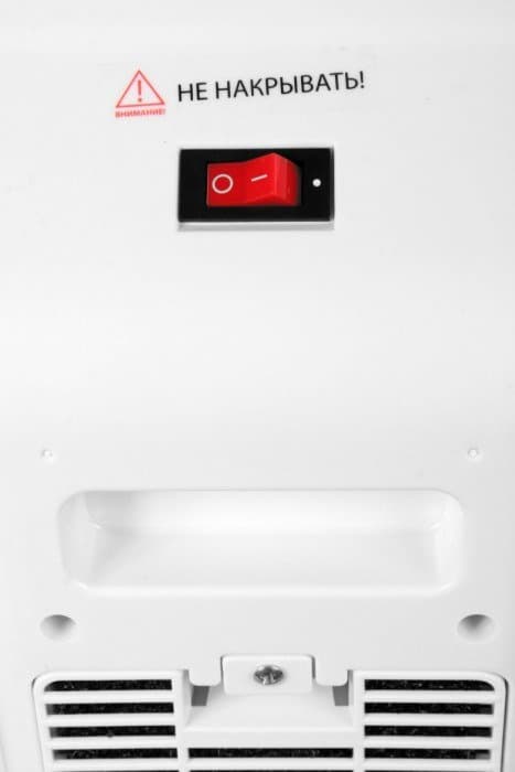 Изучив обогреватель, мы можем отметить следующие ключевые особенности: снизу можно увидеть пластмассовые ножки (жаль, что не резиновые, ведь обогреватель так и просится, чтобы его поставили прямо на стол или тумбочку), а также кнопку для защиты от переворачивания: если выключенный обогреватель уронить или просто наклонить на угол около 10-15 градусов, то характерный щелчок даст знать, что кнопка сработала и произошло аварийное отключение.