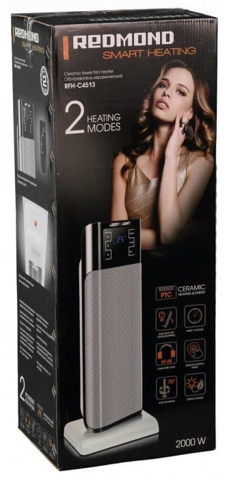 Коробка оформлена с использованием полноцветной печати. Дизайн упаковки стандартный для Redmond: фото с симпатичной девушкой, фотографии прибора, описание его основных особенностей, а также раздел с краткой технической информацией. Изучив коробку, можно узнать практически обо всех функциях обогревателя. В первую очередь это, конечно же, наличие двух режимов обогрева, функция поддержания температуры, а также низкий уровень шума и режим автоповорота.