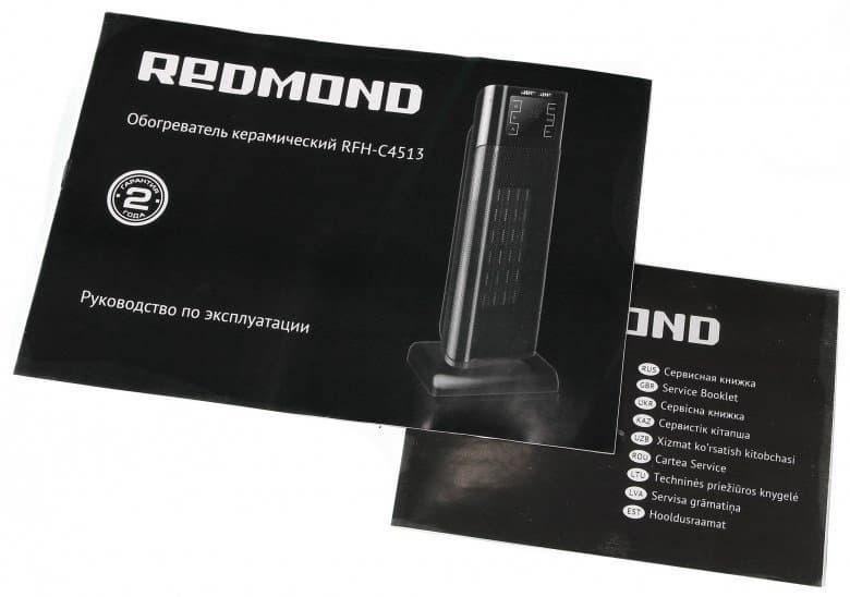 Инструкция, прилагаемая к обогревателю, нас не удивила: это стандартная брошюра, отпечатанная на глянцевой бумаге, которую можно увидеть в каждой коробке с надписью Redmond. Вся необходимая информация поместилась на 8 страницах. Тут можно найти большой раздел, посвященный мерам безопасности, технические характеристики и описание устройства прибора, правила эксплуатации и ухода, а также описание устранения простейших неполадок.