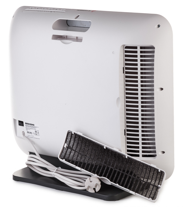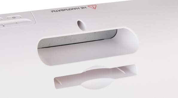На фронтальной панели внимание привлекают в первую очередь датчик движения и щель выпуска горячего воздуха. С тыльной — выключатель и несложный воздушный фильтр, крепящийся на обычной защелке.