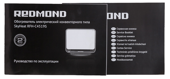 Обогреватель поставляется в картонной коробке, оформленной в стандартном стиле Redmond: черно-красная цветовая гамма, лицо «современного человека» или «человека будущего» (на этот раз это барышня в обычной одежде, без элементов футуристического дизайна). Информация на коробке содержит фото устройства и описание его основных функций и характеристик.