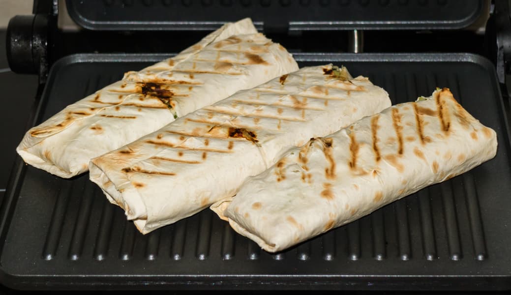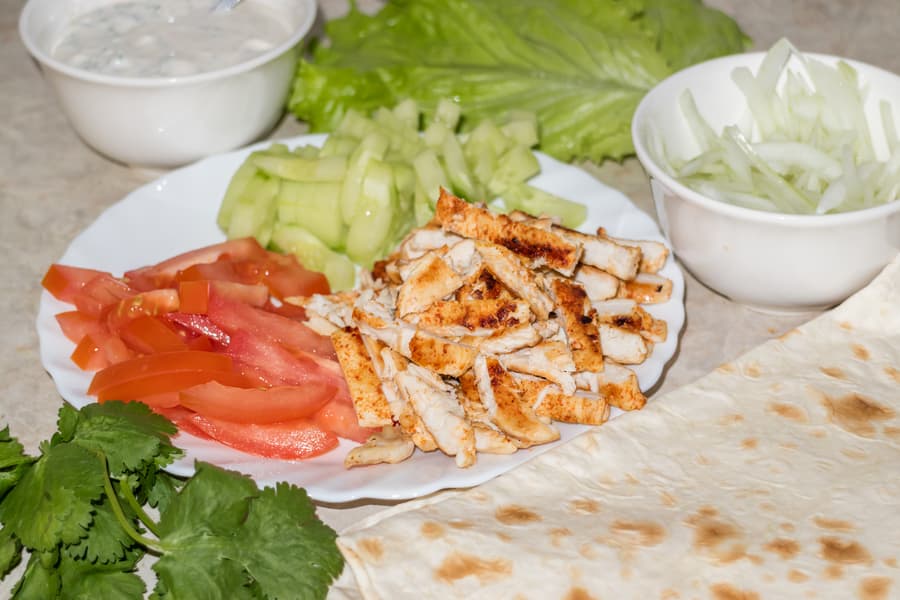 Пока филе остывало, подготовили овощи и соус, затем очистили панели гриля и запустили нагрев на 200 °C. Пока гриль доходил до нужной температуры, скрутили шаверму.