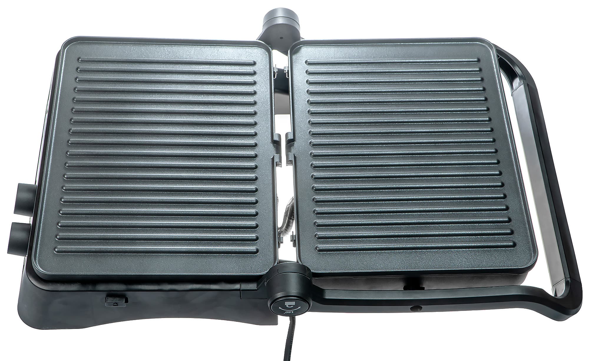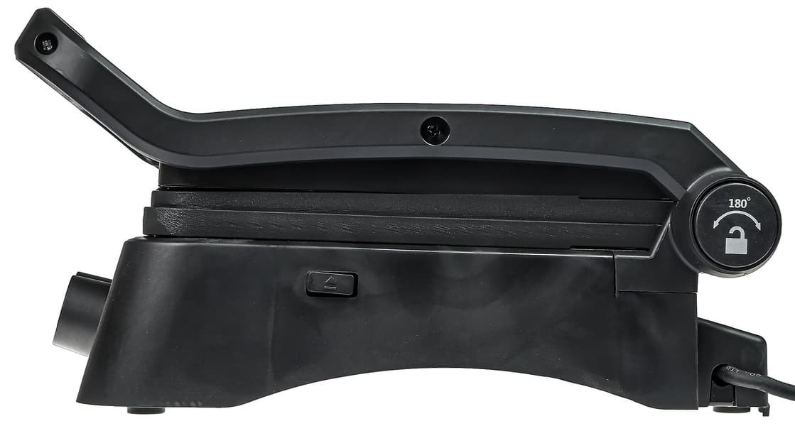 Перейдем к самому интересному — раскроем гриль. Кнопка-ограничитель, при нажатии на которую крышка откидывается на 180°, находится с правой стороны в основании ручки гриля.