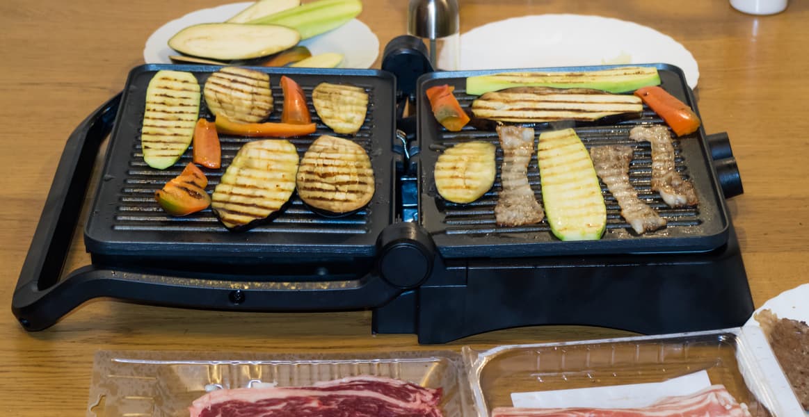 Разложили гриль на 180° и поставили в центр стола. Обе панели запустили на максимальный нагрев и укладывали на панели все продукты поочередно.