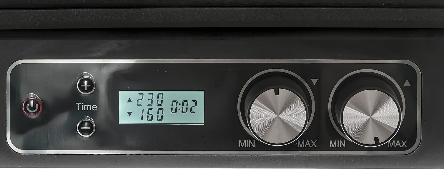 Температура устанавливается при вращении регуляторов и отражается на табло. Нагрев может быть установлен от 90 до 230 °C с шагом в 5 °C. Нагрев панелей независимый, так что можно одну панель раскалить до максимума, а вторую вообще отключить. Продолжительность работы регулируется с помощью кнопок «+» и «−». Обратный отсчет времени начинается сразу же с момента запуска работы.