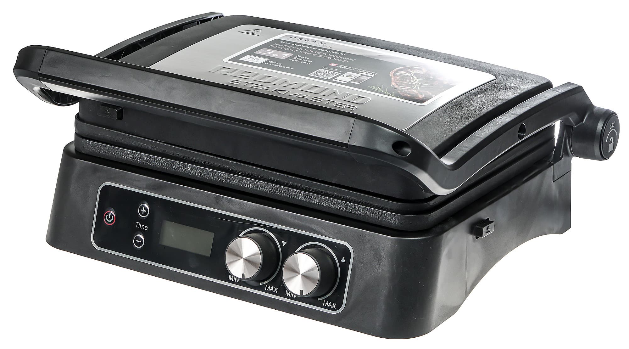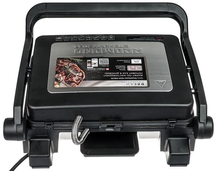 Электрический гриль Redmond SteakMaster RGM-M817D может выступать в роли трех кухонных приборов: контактного гриля, жаровни и духовки. Прибор оснащен двумя съемными панелями с антипригарным покрытием, может работать в полностью разложенном на 180° виде, а при наличии специального противня или фольгированных пакетов можно готовить внутри гриля запеканки, омлеты, рагу и выпечку.