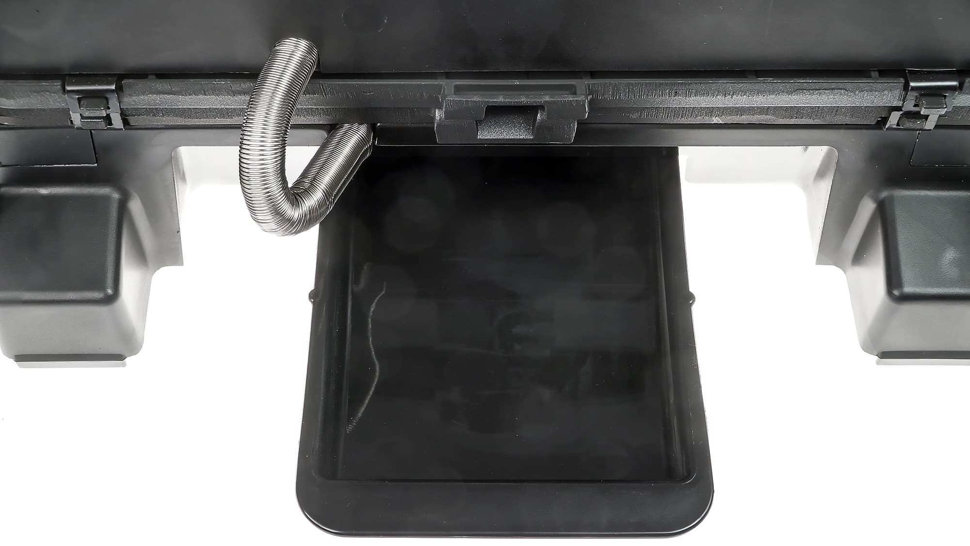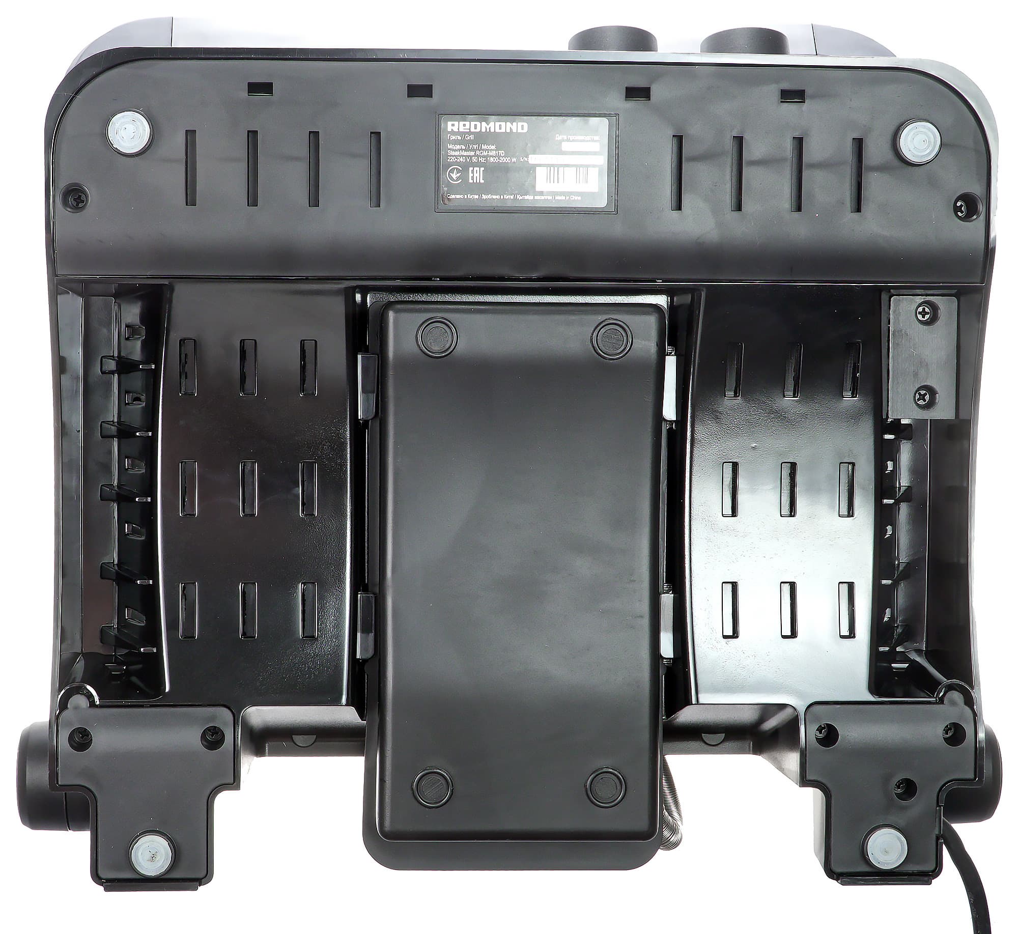 С обратной стороны корпуса видим место установки съемного поддона. Задние ножки выдаются вперед чуть более чем на 3 см, что предотвратит установку гриля вплотную к стене или каким-либо поверхностям, которые могут пострадать от жара, выделяющегося во время работы. Шнур электропитания выходит с боковой стороны одной из ножек. Длина его невелика, так что заранее следует подыскать место для размещения аппарата недалеко от розетки.