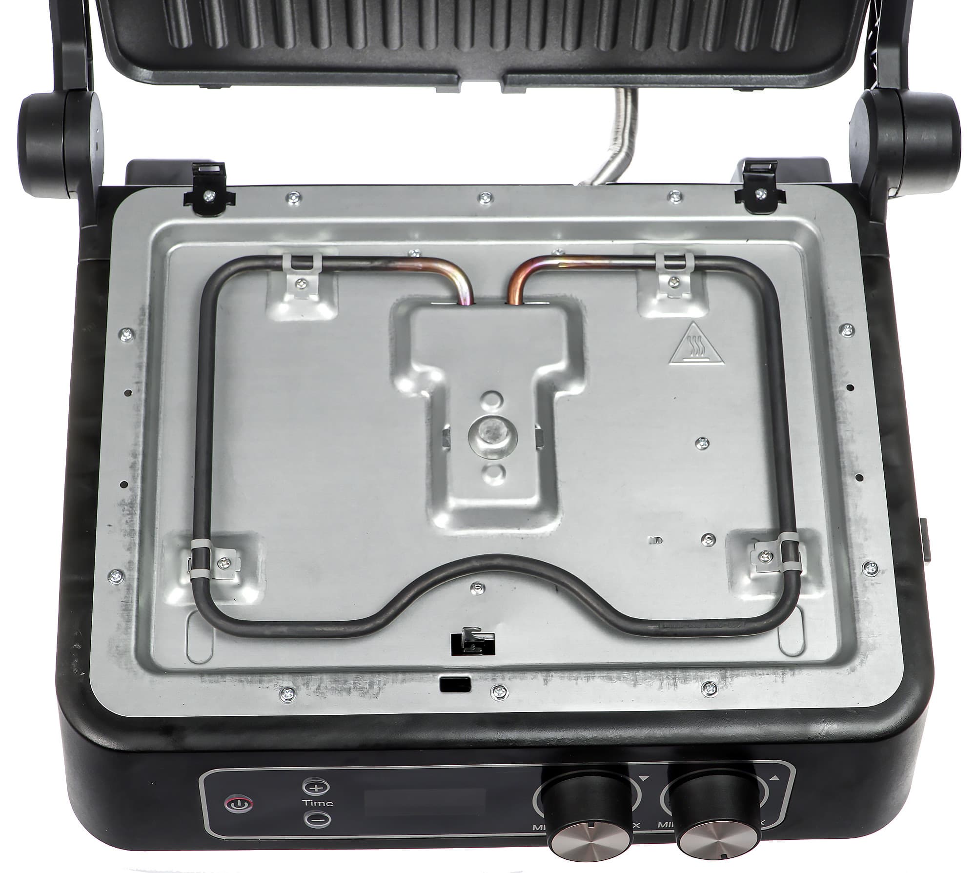 Под каждой из съемных панелей расположена металлическая вставка с напоминанием о том, что она может быть горячей, и нагревательный элемент.