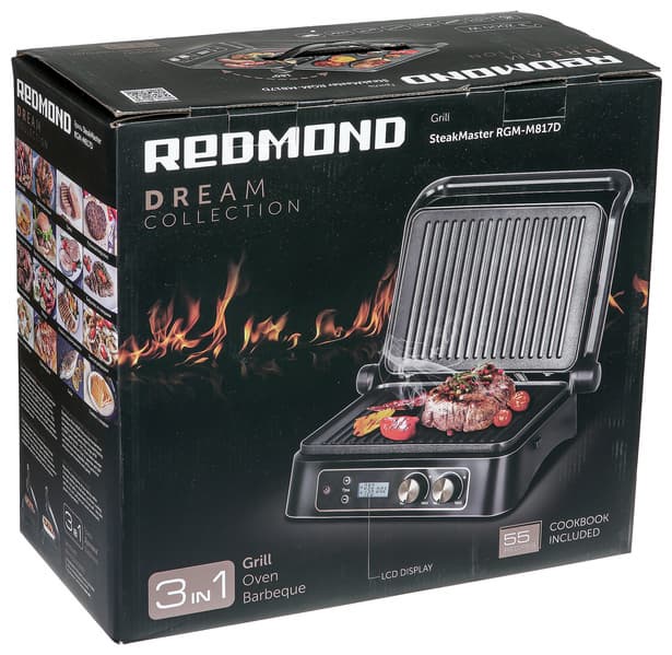 Гриль попадает в руки пользователя в картонной коробке-параллелепипеде, оформленной в узнаваемом стиле Redmond. На черном фоне выигрышно смотрятся яркие фотографии прибора и множества блюд, приготовленных с его помощью. Внимательный осмотр упаковки позволит узнать об особенностях и достоинствах гриля, а также ознакомиться с его техническими характеристиками. Коробка оснащена ручкой для переноски.