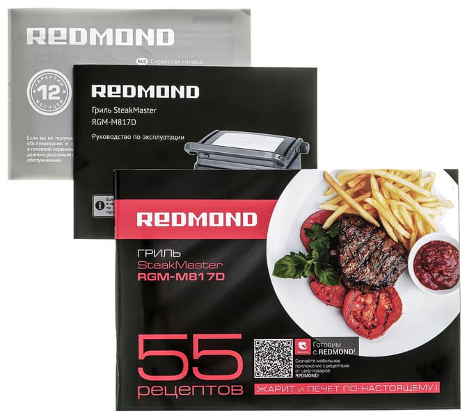 Руководство по эксплуатации выполнено в форме брошюрки формата А6. Сведения представлены на трех языках — русском, украинском и казахском. Документ содержит все необходимые сведения о Redmond SteakMaster RGM-M817D: меры безопасности, технические характеристики, описание прибора, правила подготовка к работе и эксплуатации в целом, чистки и ухода, перечень возможных ошибок при приготовлении и способы их устранения, список неисправностей с путями их устранения, а также гарантийные обязательства.