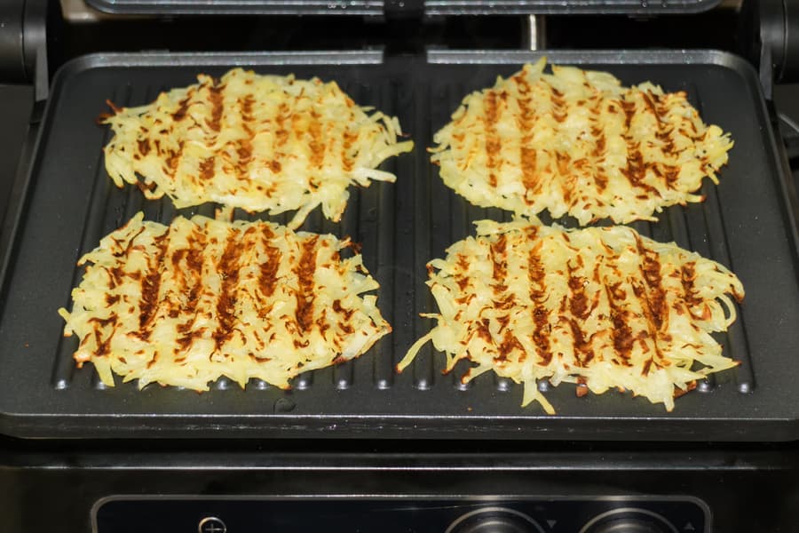 Запустили нагрев гриля на 190 °C. Заданную температуру панели достигли ровно через 3 минуты. С помощью силиконовой кисточки смазали обе жарочные поверхности растительным маслом и выложили 4 картофельных лепешки.