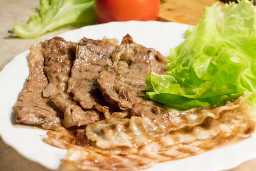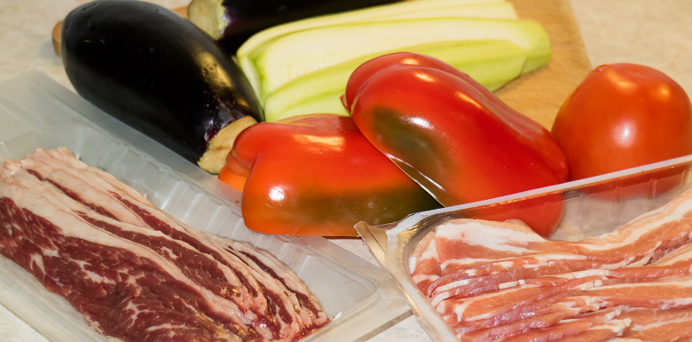 Мы подготовили пару баклажанов, кабачок, болгарский перец, сырой бекон из мраморной говядины и свиной бекон. Зелень, соусы, лепешки и прочие лаваши — опционально.