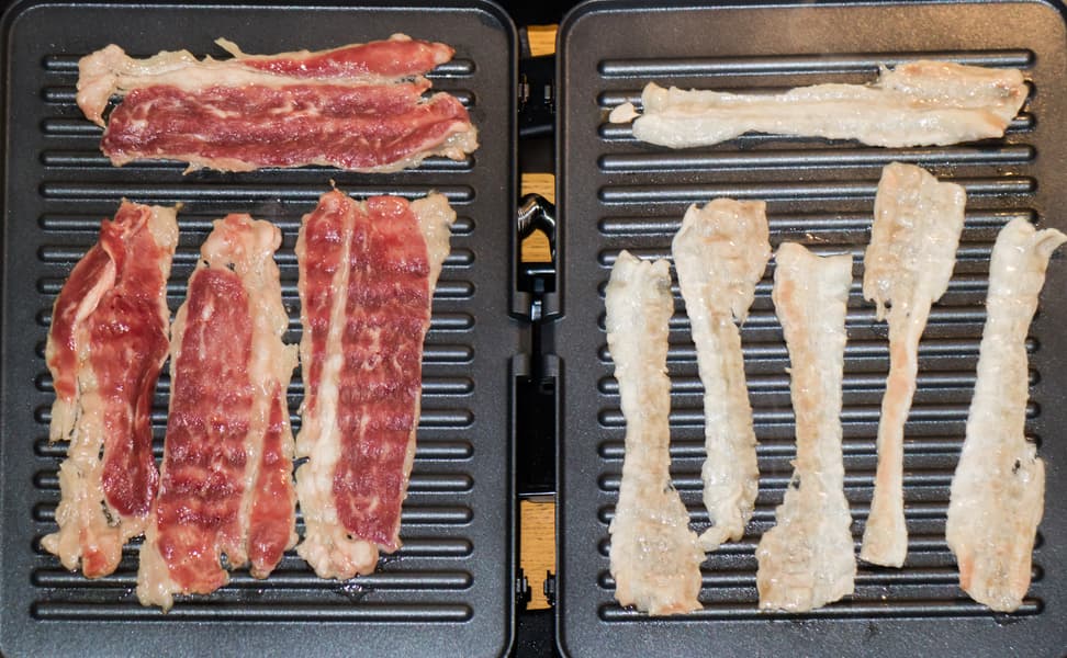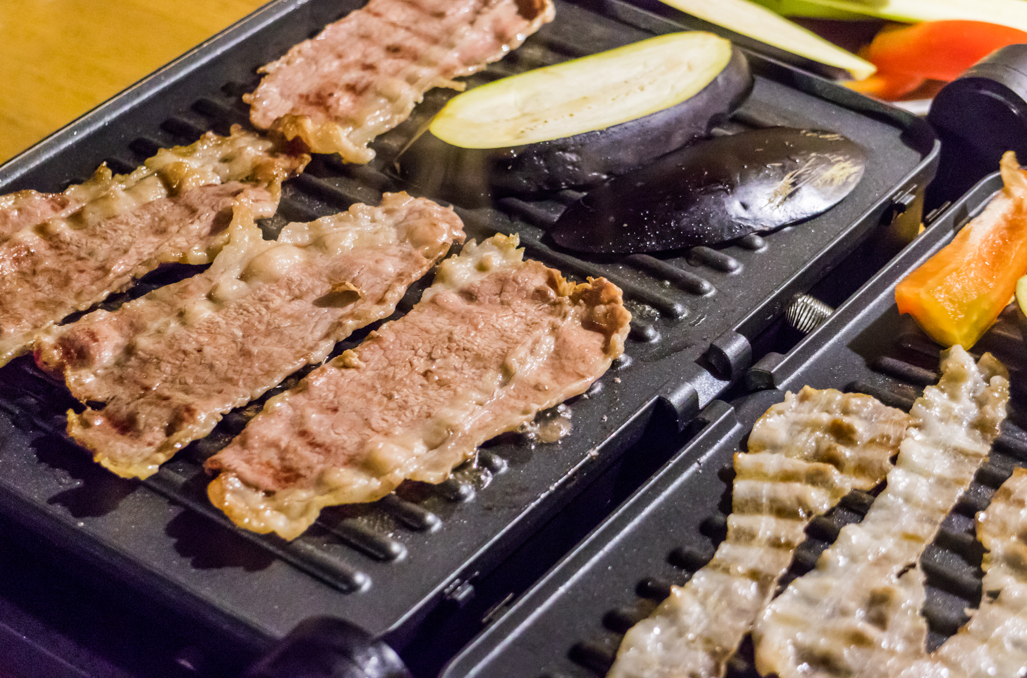 Прибор отлично проявил себя в качестве жаровни. Панели нагревались быстро, продукты обжаривались за адекватное время. Несмотря на щели между панелью и корпусом, потери тепла были, видимо, небольшими, потому что отлично, до хруста прожарился и свиной бекон, и тонкие ломтики бекона из мраморной говядины, а сочные овощи смогли подрумянится.