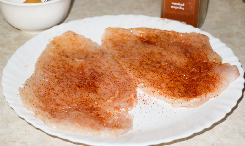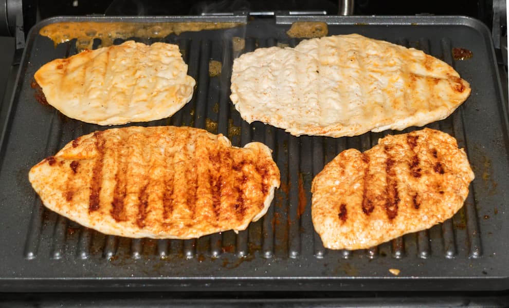Куриную грудку разрезали вдоль на две части и немного отбили. Посолили, присыпали копченой паприкой и смазали растительным маслом. Раскалили обе панели до 190 °C.
