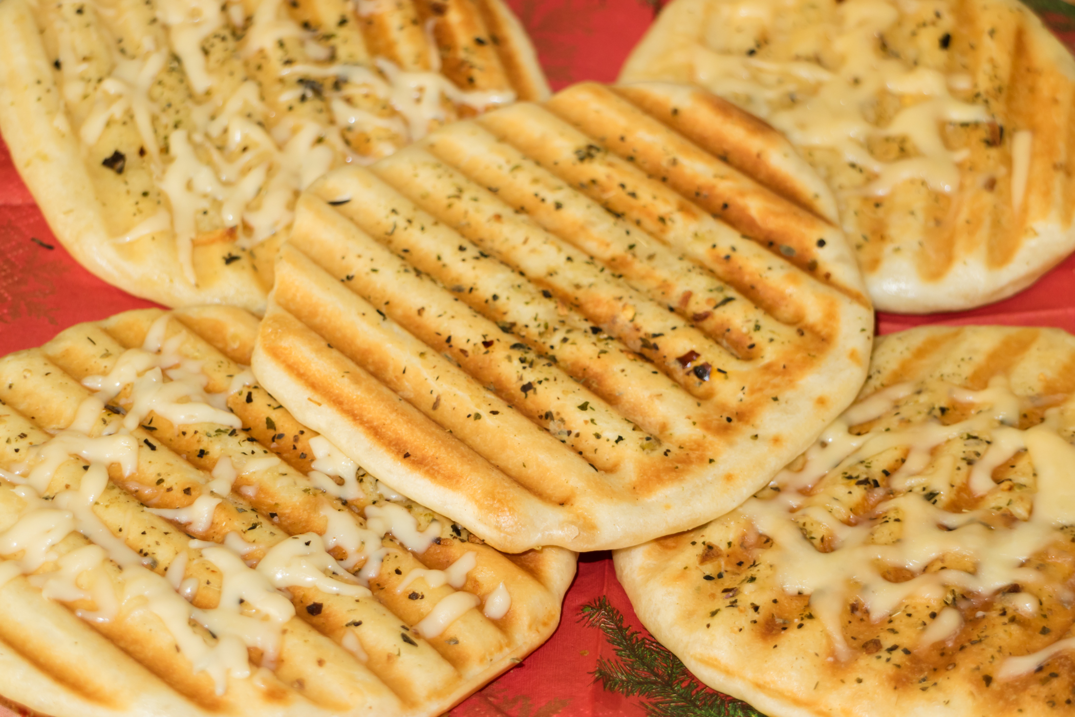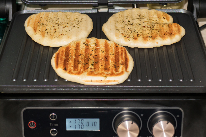 Раскалили гриль до 170 °C и уложили разом три лепешки. В этом тесте явственно видно, что нагрев панелей неравномерен — в то время как одно изделие уже поджарилось, края других были белыми. Поэтому поменяли лепешки местами.