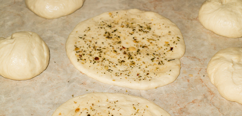 Приготовили дрожжевое тесто из указанных ингредиентов и оставили его на час в покое. Затем разделили комок на 6 кусочков, сделали лепешки, посыпали специями и смазали сверху оливковым маслом, чтобы сухие специи держались на поверхности теста.