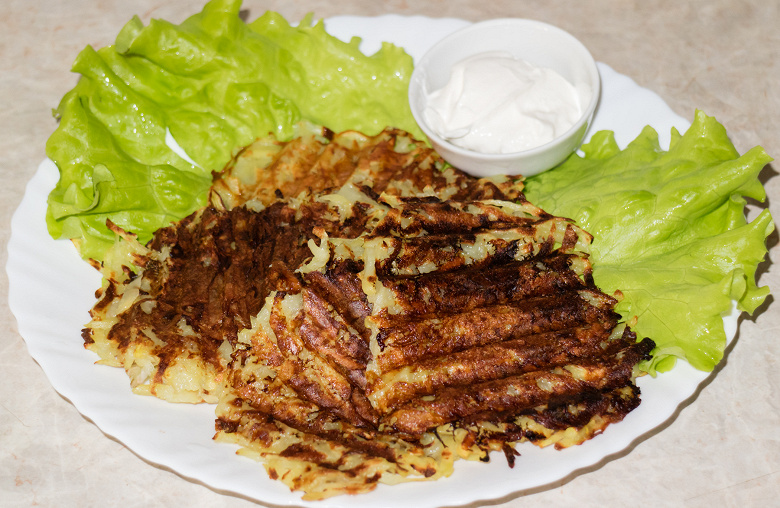 Забавное блюдо, отлично гармонирует со сметаной. Всего у нас получилось 10 больших лепешек. Жарили мы их чуть более получаса, гриль за это время израсходовал 0,584 кВт·ч.