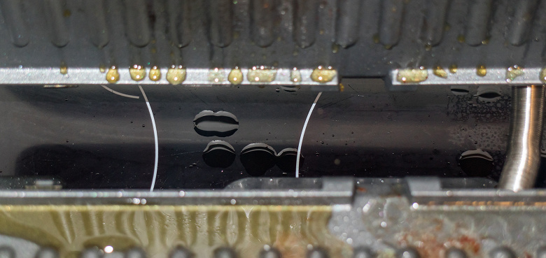 Вообще, если продукт влажный, то обжарка его нижней стороны бледнее. Влага стекает по желобкам, но удаляется не полностью, какое-то ее количество испаряется и, тем самым, «подтушивает» продукт. Ярко такая ситуация проявилась при полной загрузке гриля кусочками отбитой куриной грудки. Тем не менее, благодаря небольшому наклону панелей, влага и жир, выделяющиеся из продуктов, в основном стекают в предназначенный для того поддон. На нижней панели влага может скапливаться в левом дальнем углу.